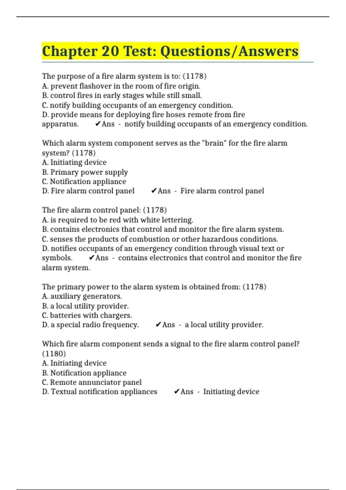 The purpose of a fire alarm system is to: (1178) A. prevent flashover in the room of fire origin. B. control fires in early stages while still small. C. notify building occupants of an emergency condition. D. provide means for deploying fire hoses remote from fire apparatus. ️Ans - notify building occupants of an emergency condition. Which alarm system component serves as the "brain" for the fire alarm system? (1178) A. Initiating device B. Primary power supply C. Notification appliance D. Fire alarm control panel ️Ans - Fire alarm control panel The fire alarm control panel: (1178) A. is required to be red with white lettering. B. contains electronics that control and monitor the fire alarm system. C. senses the products of combustion or other hazardous conditions. D. notifies occupants of an emergency condition through visual text or symbols. ️Ans - contains electronics that control and monitor the fire alarm system. The primary power to the alarm system is obtained from: (1178) A. auxiliary generators. B. a local utility provider. C. batteries with chargers. D. a special radio frequency. ️Ans - a local utility provider. Which fire alarm component sends a signal to the fire alarm control panel? (1180) A. Initiating device B. Notification appliance C. Remote annunciator panel D. Textual notification appliances ️Ans - Initiating device After receiving a signal from an initiating device, the control panel activates: (1180) A. a manual pull station. B. notification appliances. C. secondary power supplies. D. the contacts in a frangible bulb. ️Ans - notification appliances. Which is the most common category of notification appliances? (1180) A. Visual B. Textual C. Tactile D. Audible ️Ans - Audible Strobe lights are an example of which notification appliance category? (1180) A. Visual B. Textual C. Conductive D. Addressable ️Ans - Visual The fire command center: (1181) A. senses products of combustion. B. serves as the connection point for power and fire alarm circuits. C. consolidates all fire protection system controls for a structure in one room. D. ensures the fire alarm system will operate if the primary power supply fails. ️Ans - consolidates all fire protection system controls for a structure in one room. Which type of alarm signaling system is designed to provide notification to building occupants on the immediate premises? (1182) A. Central station B. Remote receiving C. Protected premises D. Supervising station ️Ans - Protected premises The fire alarm control panel in a (an) ___ system is not capable of identifying the initiating device that triggered the alarm. (1182) A. coded alarm