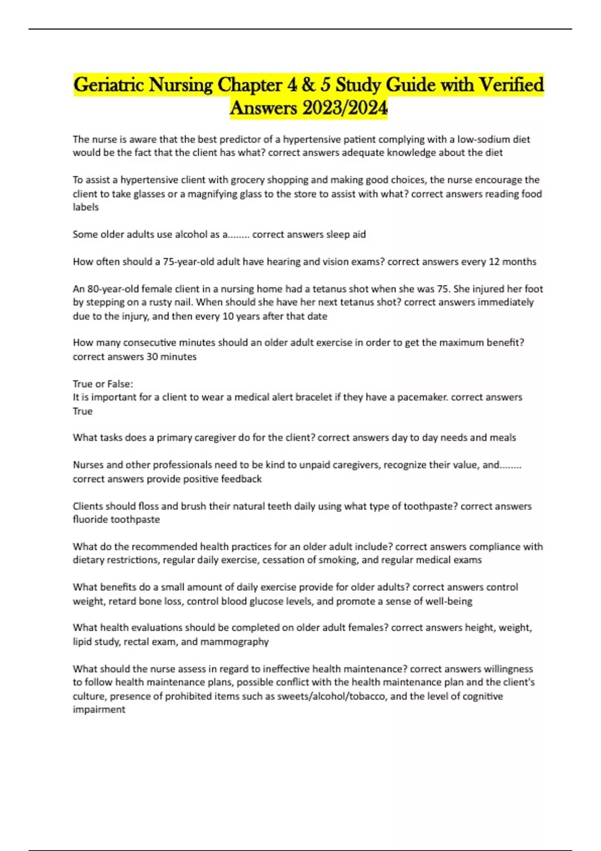 Geriatric Nursing Chapter 4 & 5 Study Guide with Verified Answers 2023/2024 The nurse is aware that the best predictor of a hypertensive patient complying with a low-sodium diet would be the fact that the client has what? correct answers adequate knowledge about the diet To assist a hypertensive client with grocery shopping and making good choices, the nurse encourage the client to take glasses or a magnifying glass to the store to assist with what? correct answers reading food labels Some older adults use alcohol as a........ correct answers sleep aid How often should a 75-year-old adult have hearing and vision exams? correct answers every 12 months An 80-year-old female client in a nursing home had a tetanus shot when she was 75. She injured her foot by stepping on a rusty nail. When should she have her next tetanus shot? correct answers immediately due to the injury, and then every 10 years after that date How many consecutive minutes should an older adult exercise in order to get the maximum benefit? correct answers 30 minutes True or False: It is important for a client to wear a medical alert bracelet if they have a pacemaker. correct answers True What tasks does a primary caregiver do for the client? correct answers day to day needs and meals Nurses and other professionals need to be kind to unpaid caregivers, recognize their value, and........ correct answers provide positive feedback Clients should floss and brush their natural teeth daily using what type of toothpaste? correct answers fluoride toothpaste What do the recommended health practices for an older adult include? correct answers compliance with dietary restrictions, regular daily exercise, cessation of smoking, and regular medical exams What benefits do a small amount of daily exercise provide for older adults? correct answers control weight, retard bone loss, control blood glucose levels, and promote a sense of well-being