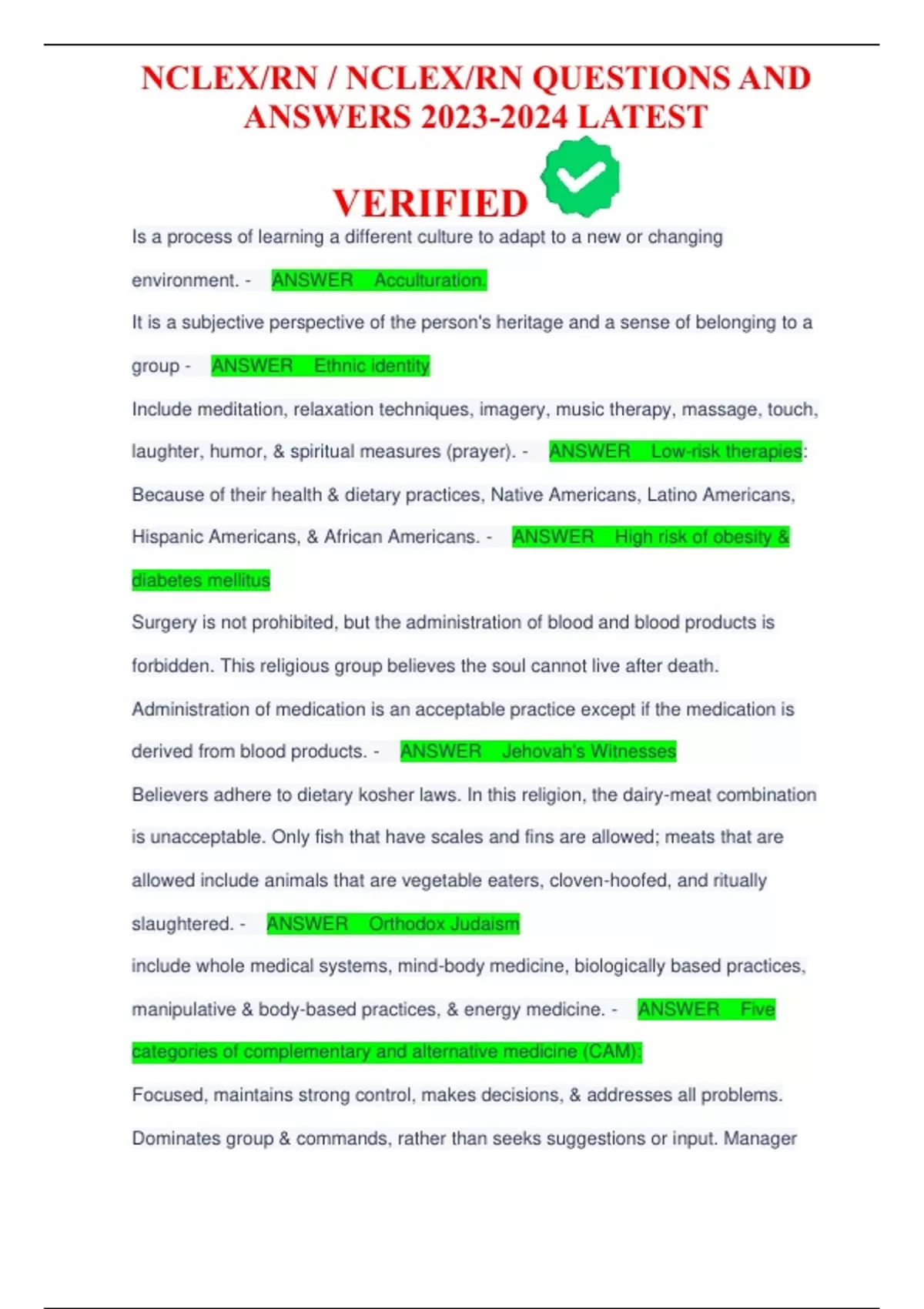 Is a process of learning a different culture to adapt to a new or changing environment. - ANSWER Acculturation. It is a subjective perspective of the person's heritage and a sense of belonging to a group - ANSWER Ethnic identity Include meditation, relaxation techniques, imagery, music therapy, massage, touch, laughter, humor, & spiritual measures (prayer). - ANSWER Low-risk therapies: Because of their health & dietary practices, Native Americans, Latino Americans, Hispanic Americans, & African Americans. - ANSWER High risk of obesity & diabetes mellitus Surgery is not prohibited, but the administration of blood and blood products is forbidden. This religious group believes the soul cannot live after death. Administration of medication is an acceptable practice except if the medication is derived from blood products. - ANSWER Jehovah's Witnesses Believers adhere to dietary kosher laws. In this religion, the dairy-meat combination is unacceptable. Only fish that have scales and fins are allowed; meats that are allowed include animals that are vegetable eaters, cloven-hoofed, and ritually slaughtered. - ANSWER Orthodox Judaism include whole medical systems, mind-body medicine, biologically based practices, manipulative & body-based practices, & energy medicine. - ANSWER Five categories of complementary and alternative medicine (CAM): Focused, maintains strong control, makes decisions, & addresses all problems. Dominates group & commands, rather than seeks suggestions or input. Manager