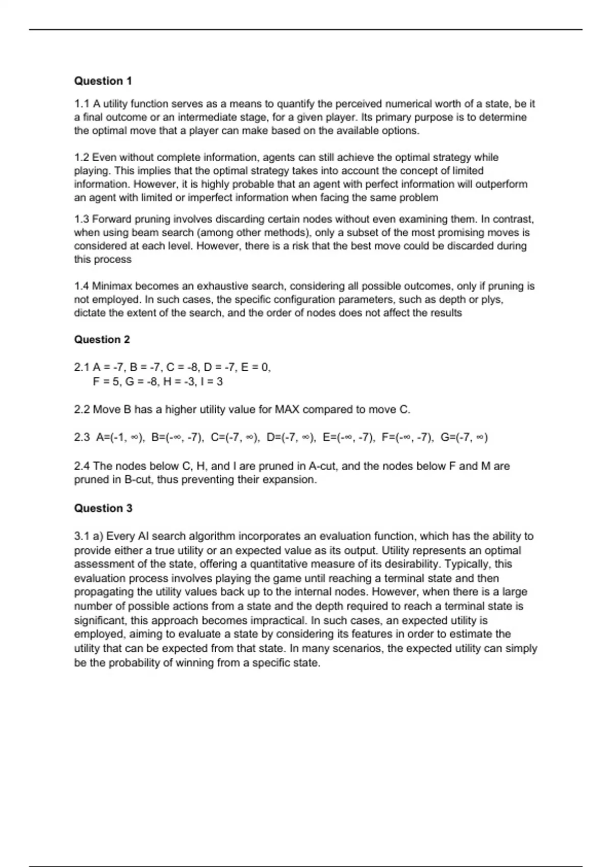1.4 Minimax becomes an exhaustive search, considering all possible outcomes, only if pruning is