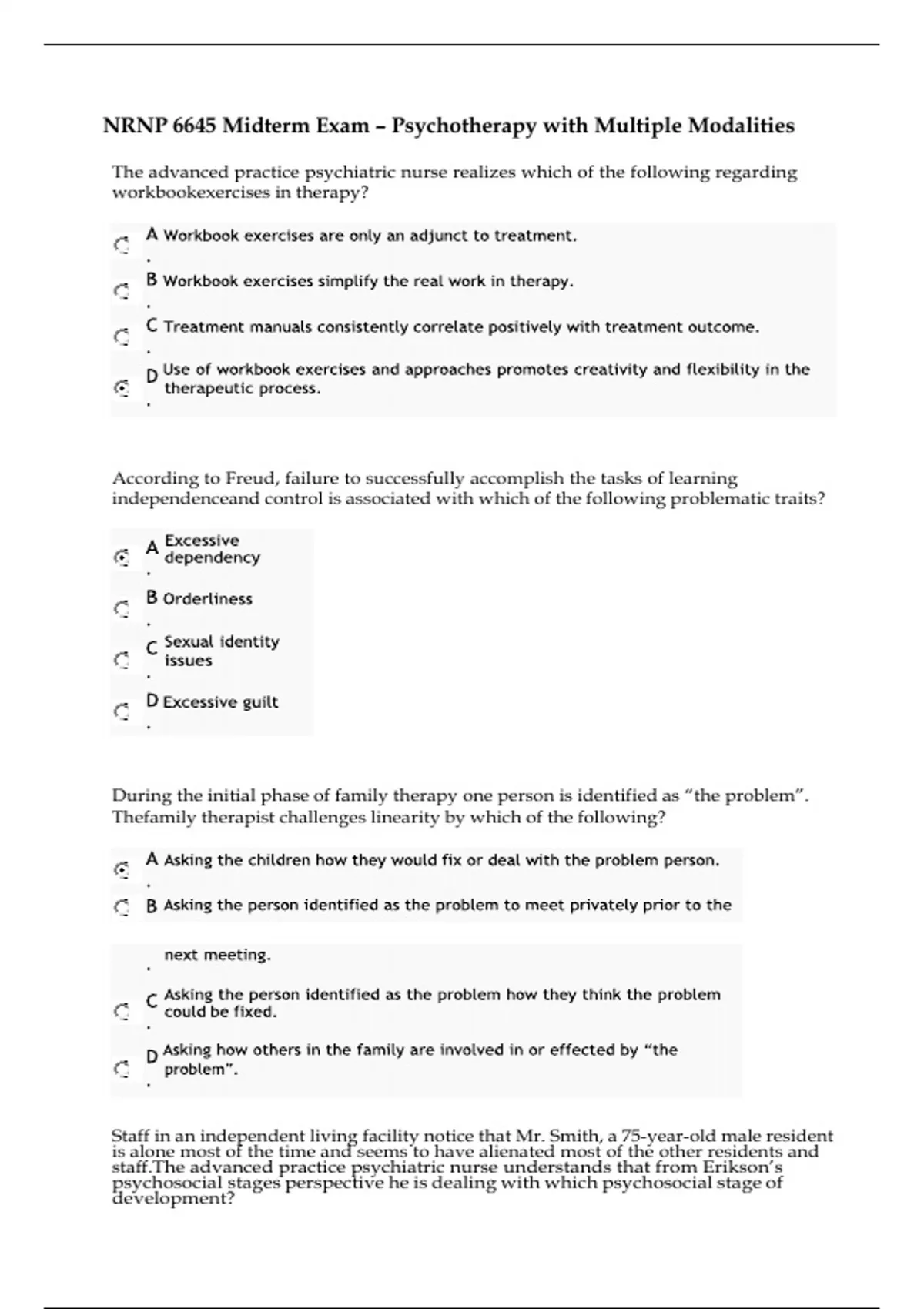NRNP 6645 Midterm Exam – Psychotherapy with Multiple Modalities. The advanced practice psychiatric nurse realizes which of the following regarding workbook exercises in therapy? According to Freud, failure to successfully accomplish the tasks of learning independence and control is associated with which of the following problematic traits?