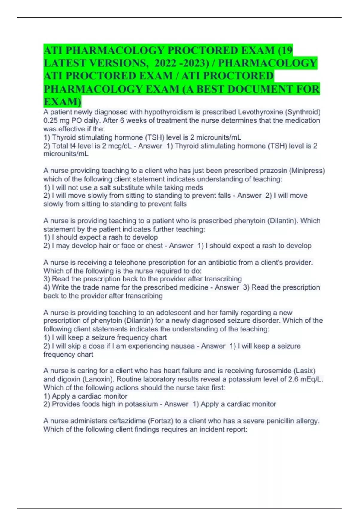 ATI PHARMACOLOGY PROCTORED EXAM (19 LATEST VERSIONS, ) / PHARMACOLOGY ATI PROCTORED EXAM / ATI PROCTORED PHARMACOLOGY EXAM (A BEST DOCUMENT FOR EXAM)