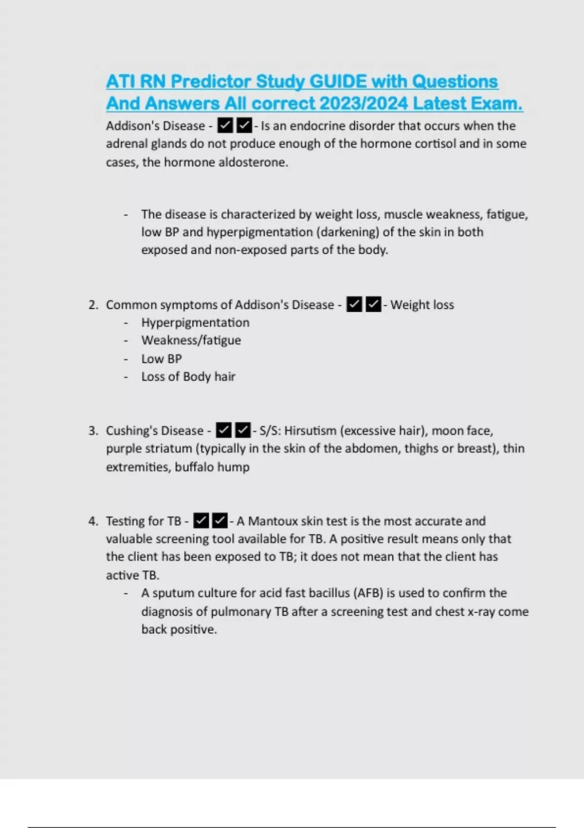 ATI RN Predictor Study GUIDE with Questions And Answers All correct 2023/2024 Latest Exam. Addison's Disease - - Is an endocrine disorder that occurs when the adrenal glands do not produce enough of the hormone cortisol and in some cases, the hormone aldosterone.
