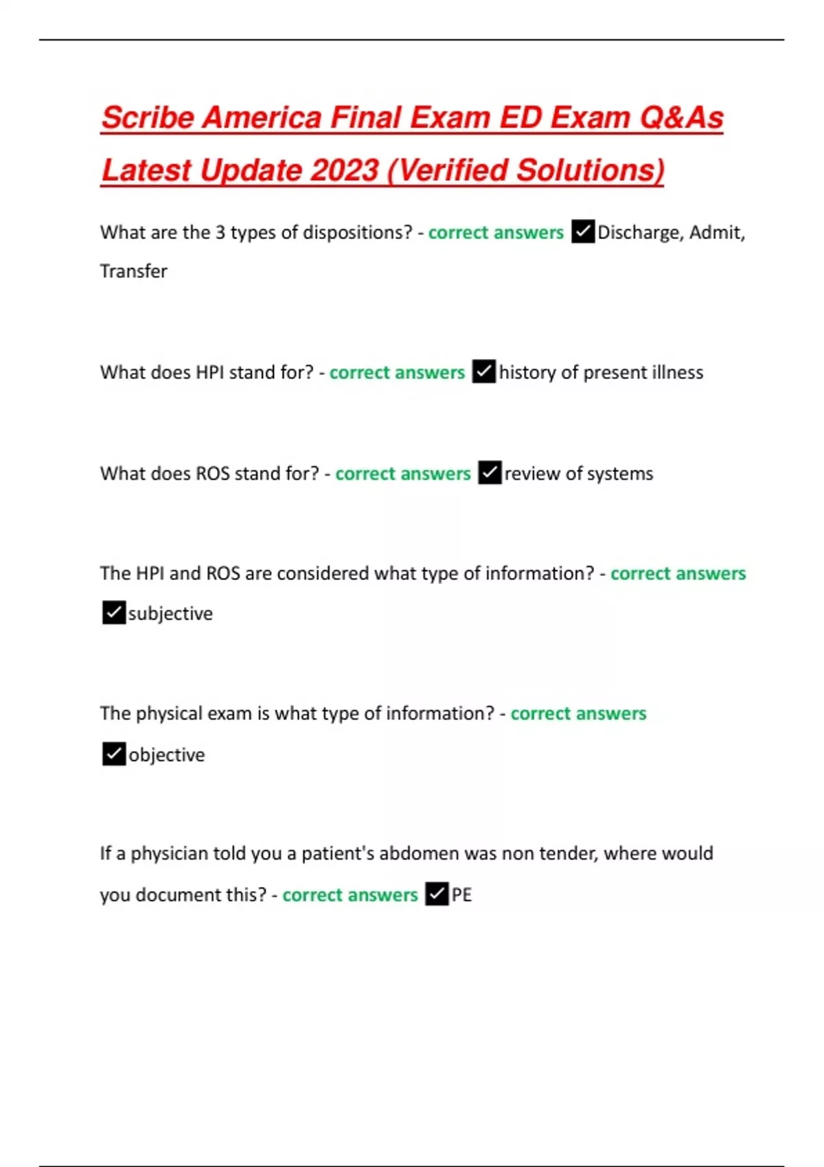 Scribe America Final Exam ED Exam Q&As Latest Update 2023 (Verified Solutions) What are the 3 types of dispositions? - correct answers Discharge, Admit, Transfer What does HPI stand for? - correct answers history of present illness What does ROS stand for? - correct answers review of systems