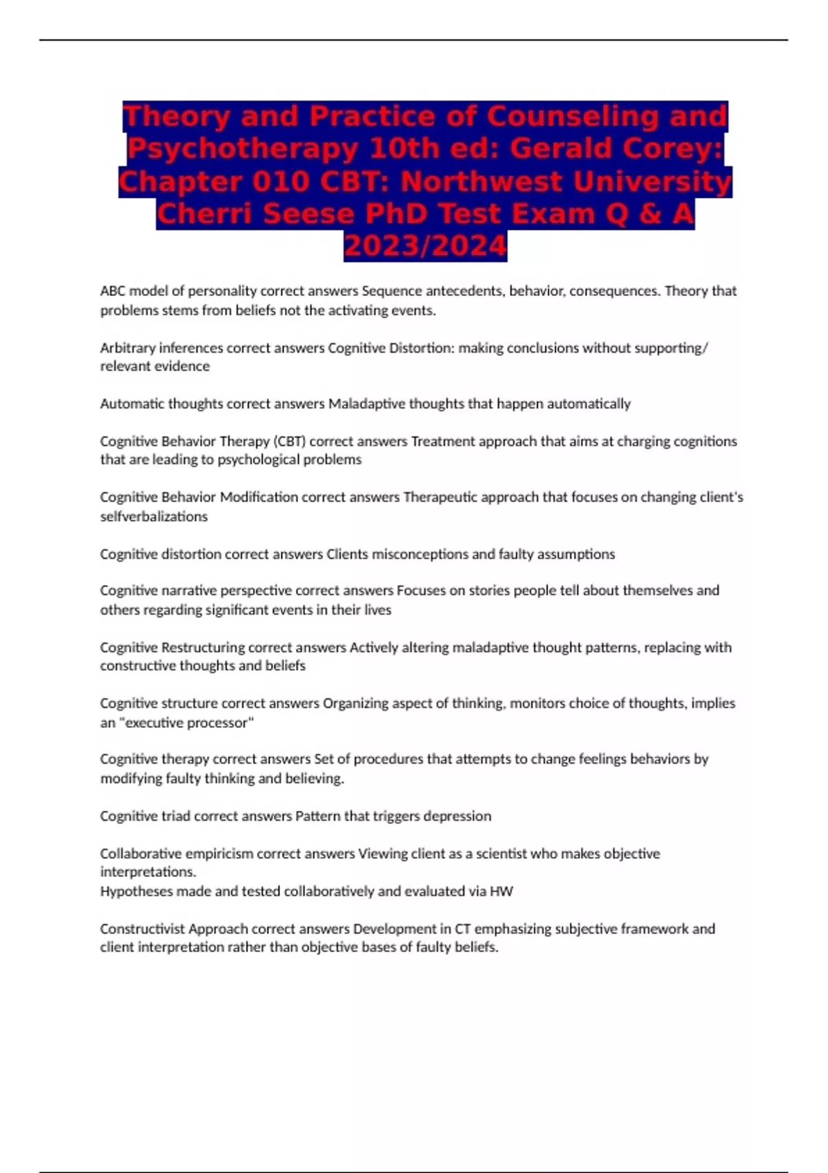 Cognitive Behavior Therapy (CBT) correct answers Treatment approach that aims at charging cognitions