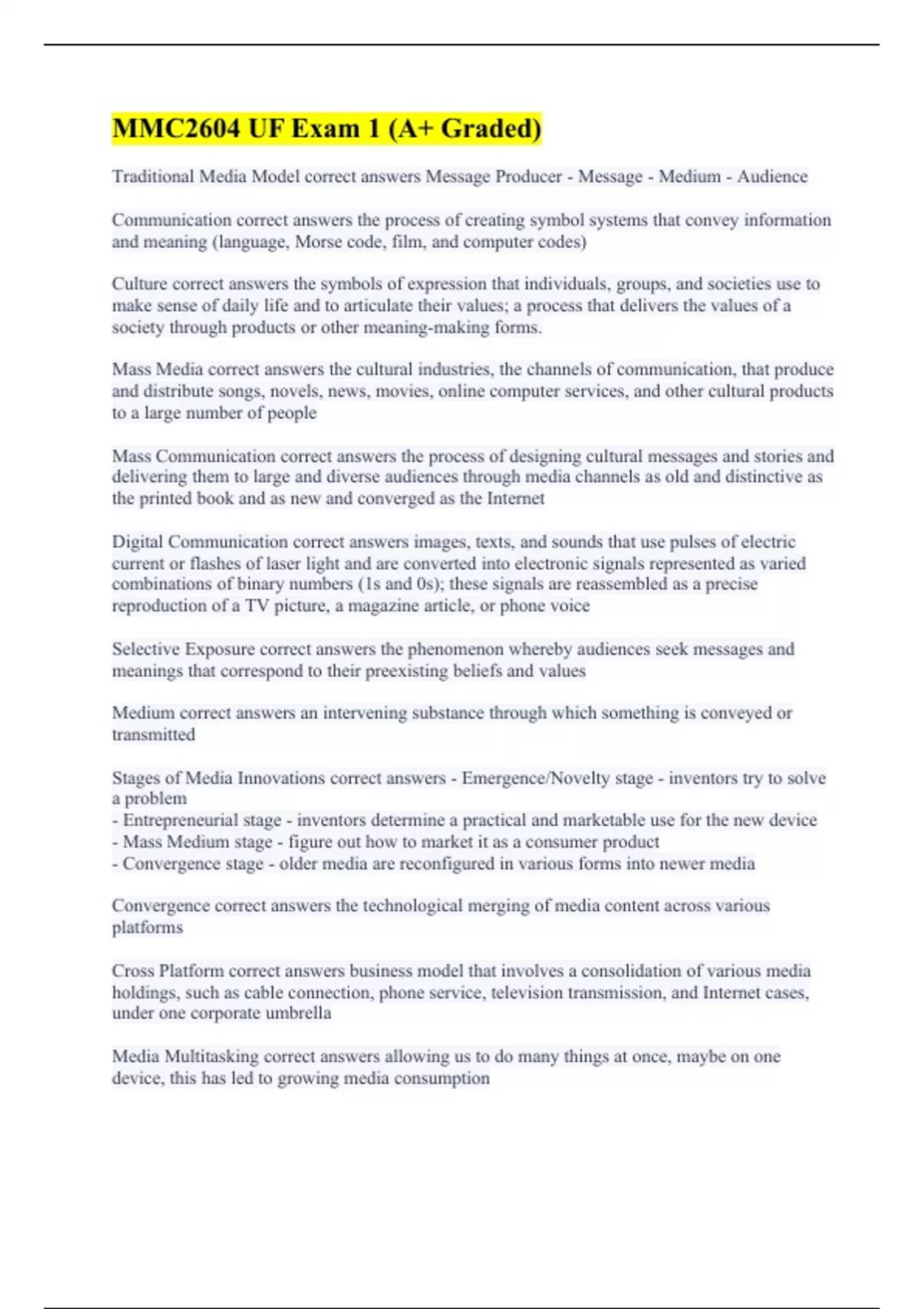 Traditional Media Model correct answers Message Producer - Message - Medium - Audience Communication correct answers the process of creating symbol systems that convey information and meaning (language, Morse code, film, and computer codes) Culture correct answers the symbols of expression that individuals, groups, and societies use to make sense of daily life and to articulate their values; a process that delivers the values of a society through products or other meaning-making forms. Mass Media correct answers the cultural industries, the channels of communication, that produce and distribute songs, novels, news, movies, online computer services, and other cultural products to a large number of people Mass Communication correct answers the process of designing cultural messages and stories and delivering them to large and diverse audiences through media channels as old and distinctive as the printed book and as new and converged as the Internet Digital Communication correct answers images, texts, and sounds that use pulses of electric current or flashes of laser light and are converted into electronic signals represented as varied combinations of binary numbers (1s and 0s); these signals are reassembled as a precise reproduction of a TV picture, a magazine article, or phone voice Selective Exposure correct answers the phenomenon whereby audiences seek messages and meanings that correspond to their preexisting beliefs and values Medium correct answers an intervening substance through which something is conveyed or transmitted Stages of Media Innovations correct answers - Emergence/Novelty stage - inventors try to solve a problem - Entrepreneurial stage - inventors determine a practical and marketable use for the new device - Mass Medium stage - figure out how to market it as a consumer product - Convergence stage - older media are reconfigured in various forms into newer media Convergence correct answers the technological merging of media content across various platforms Cross Platform correct answers business model that involves a consolidation of various media holdings, such as cable connection, phone service, television transmission, and Internet cases, under one corporate umbrella Media Multitasking correct answers allowing us to do many things at once, maybe on one device, this has led to growing media consumption