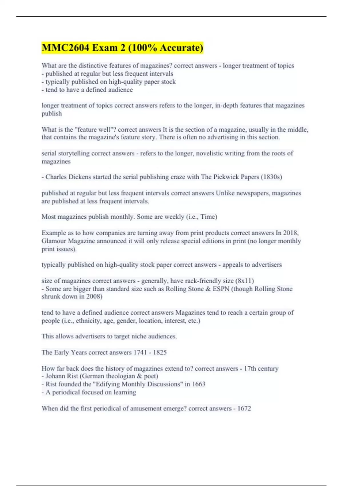What are the distinctive features of magazines? correct answers - longer treatment of topics - published at regular but less frequent intervals - typically published on high-quality paper stock - tend to have a defined audience longer treatment of topics correct answers refers to the longer, in-depth features that magazines publish What is the "feature well"? correct answers It is the section of a magazine, usually in the middle, that contains the magazine's feature story. There is often no advertising in this section. serial storytelling correct answers - refers to the longer, novelistic writing from the roots of magazines - Charles Dickens started the serial publishing craze with The Pickwick Papers (1830s) published at regular but less frequent intervals correct answers Unlike newspapers, magazines are published at less frequent intervals. Most magazines publish monthly. Some are weekly (i.e., Time) Example as to how companies are turning away from print products correct answers In 2018, Glamour Magazine announced it will only release special editions in print (no longer monthly print issues). typically published on high-quality stock paper correct answers - appeals to advertisers size of magazines correct answers - generally, have rack-friendly size (8x11) - Some are bigger than standard size such as Rolling Stone & ESPN (though Rolling Stone shrunk down in 2008) tend to have a defined audience correct answers Magazines tend to reach a certain group of people (i.e., ethnicity, age, gender, location, interest, etc.) This allows advertisers to target niche audiences. The Early Years correct answers How far back does the history of magazines extend to? correct answers - 17th century - Johann Rist (German theologian & poet) - Rist founded the "Edifying Monthly Discussions" in 1663 - A periodical focused on learning When did the first periodical of amusement emerge? correct answers - 1672
