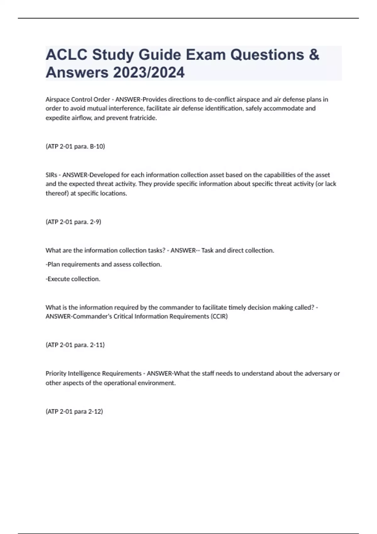 ACLC Study Guide Exam Questions & Answers 2023/2024 Airspace Control Order - ANSWER-Provides directions to de-conflict airspace and air defense plans in order to avoid mutual interference, facilitate air defense identification, safely accommodate and expedite airflow, and prevent fratricide. (ATP 2-01 para. B-10) SIRs - ANSWER-Developed for each information collection asset based on the capabilities of the asset and the expected threat activity. They provide specific information about specific threat activity (or lack thereof) at specific locations. (ATP 2-01 para. 2-9) What are the information collection tasks? - ANSWER-- Task and direct collection. -Plan requirements and assess collection. -Execute collection. What is the information required by the commander to facilitate timely decision making called? - ANSWER-Commander's Critical Information Requirements (CCIR) (ATP 2-01 para. 2-11) Priority Intelligence Requirements - ANSWER-What the staff needs to understand about the adversary or other aspects of the operational environment. (ATP 2-01 para 2-12)