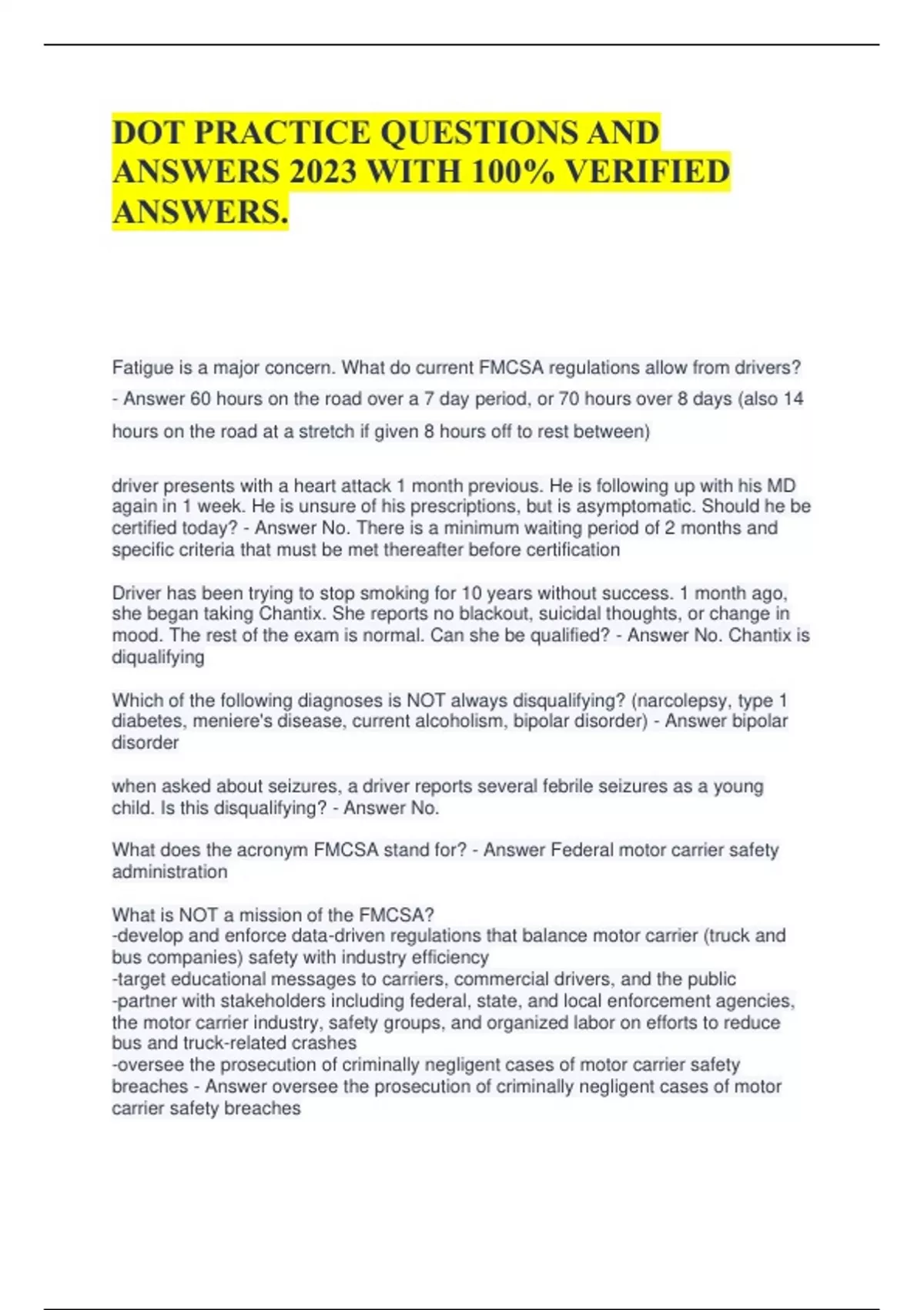 DOT PRACTICE QUESTIONS AND ANSWERS 2023 WITH 100% VERIFIED ANSWERS.