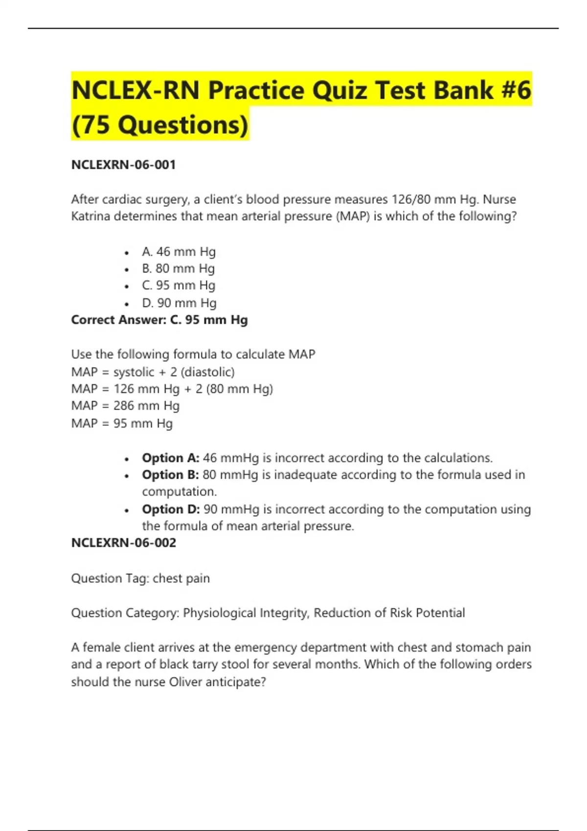 After cardiac surgery, a client’s blood pressure measures 126/80 mm Hg. Nurse Katrina determines that mean arterial pressure (MAP) is which of the following? A. 46 mm Hg B. 80 mm Hg C. 95 mm Hg D. 90 mm Hg Correct Answer: C. 95 mm Hg
