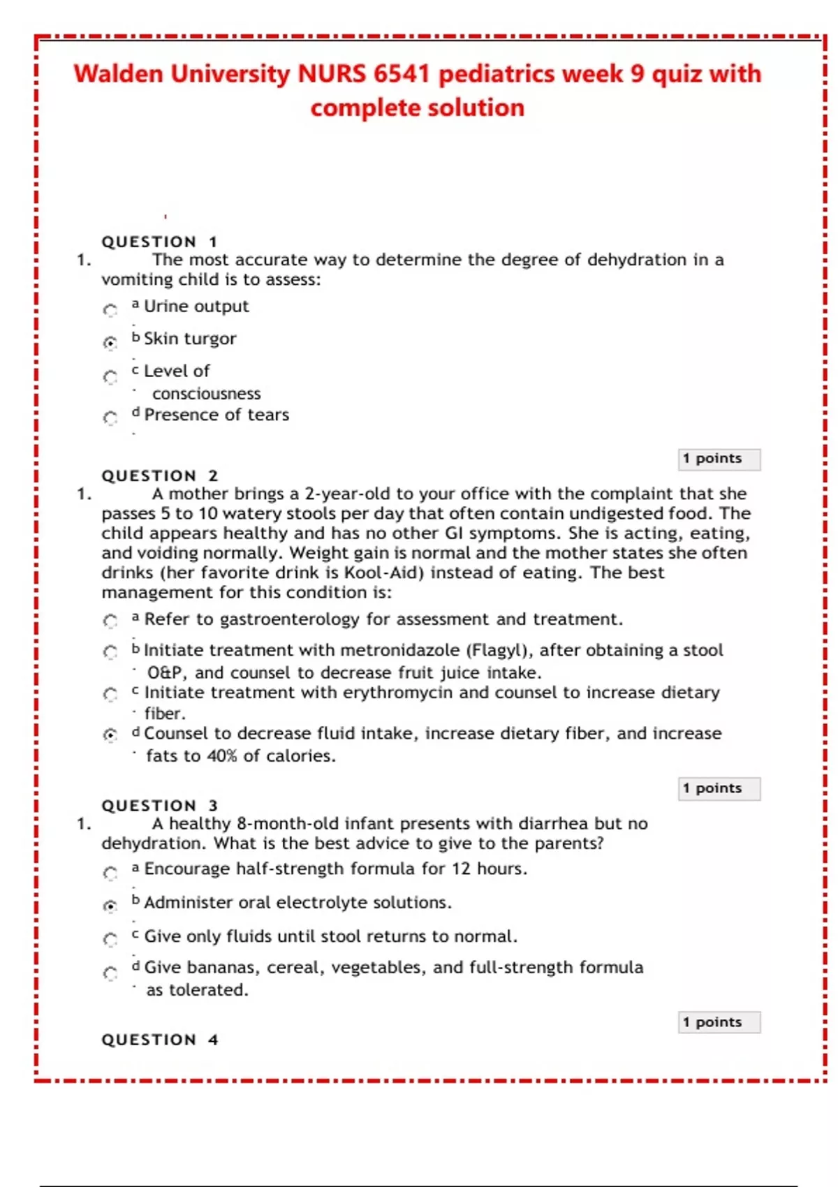 Walden University NURS 6541 pediatrics week 9 quiz with complete solution QUESTION 1 1. The most accurate way to determine the degree of dehydration in a vomiting child is to assess: a Urine output . b Skin turgor . c Level of . consciousness d Presence of tears . QUESTION 2 1. A mother brings a 2-year-old to your office with the complaint that she passes 5 to 10 watery stools per day that often contain undigested food. The child appears healthy and has no other GI symptoms. She is acting, eating, and voiding normally. Weight gain is normal and the mother states she often drinks (her favorite drink is Kool-Aid) instead of eating. The best management for this condition is: a Refer to gastroenterology for assessment and treatment. . b Initiate treatment with metronidazole (Flagyl), after obtaining a stool . O&P, and counsel to decrease fruit juice intake. c Initiate treatment with erythromycin and counsel to increase dietary . fiber. d Counsel to decrease fluid intake, increase dietary fiber, and increase . fats to 40% of calories. QUESTION 3 1. A healthy 8-month-old infant presents with diarrhea but no dehydration. What is the best advice to give to the parents? a Encourage half-strength formula for 12 hours. . b Administer oral electrolyte solutions. . c Give only fluids until stool returns to normal. . d Give bananas, cereal, vegetables, and full-strength formula