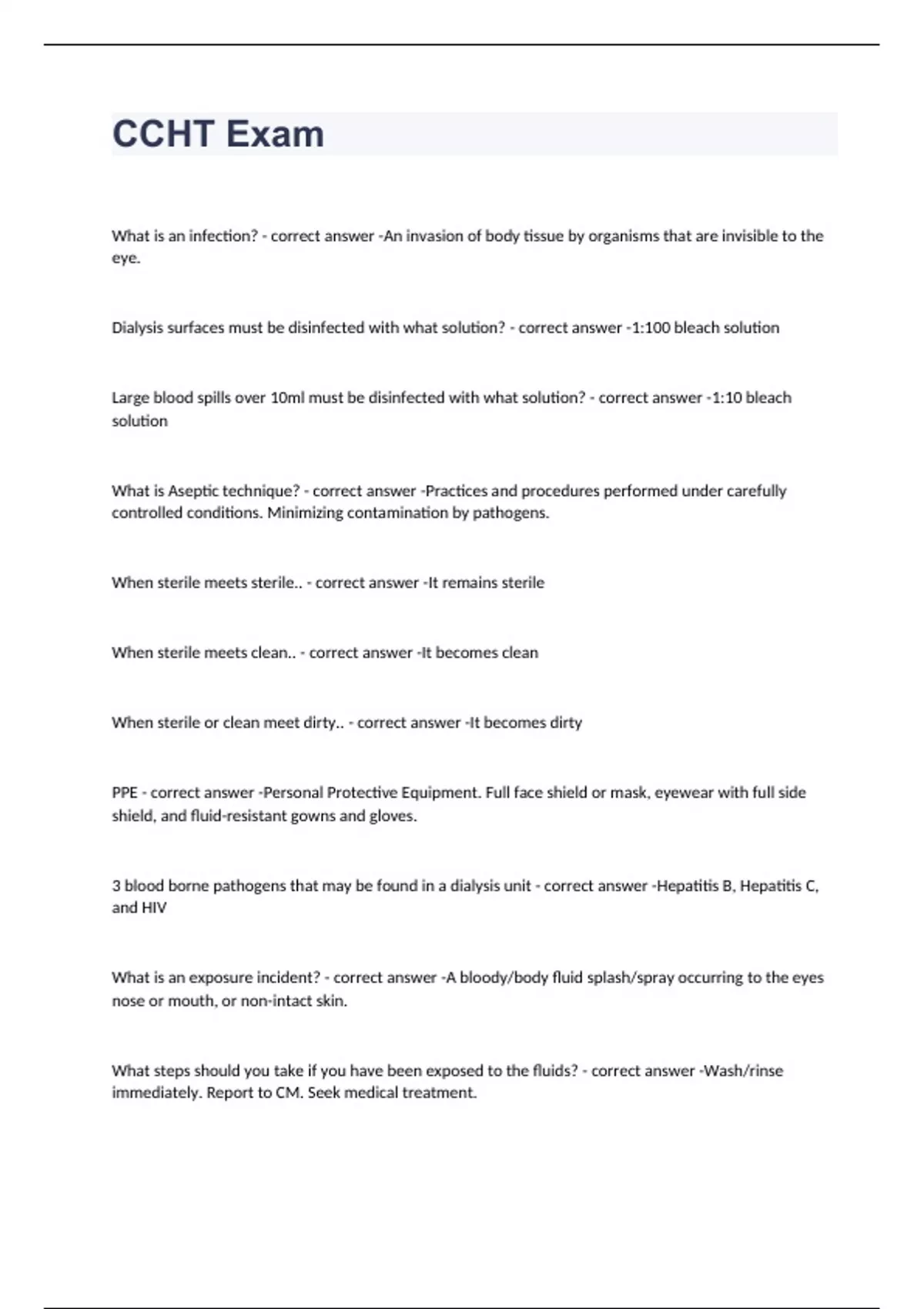 What is an infection? An invasion of body tissue by organisms that are invisible to the eye. Dialysis surfaces must be disinfected with what solution? 1:100 bleach solution Large blood spills over 10ml must be disinfected with what solution? 1:10 bleach solution What is Aseptic technique? Practices and procedures performed under carefully controlled conditions. Minimizing contamination by pathogens. When sterile meets sterile.. It remains sterile When sterile meets clean.. It becomes clean When sterile or clean meet dirty.. It becomes dirty PPE Personal Protective Equipment. Full face shield or mask, eyewear with full side shield, and fluid-resistant gowns and gloves. 3 blood borne pathogens that may be found in a dialysis unit Hepatitis B, Hepatitis C, and HIV What is an exposure incident? A bloody/body fluid splash/spray occurring to the eyes nose or mouth, or non-intact skin. What steps should you take if you have been exposed to the fluids? Wash/rinse immediately. Report to CM. Seek medical treatment. What is hepatitis? Inflammation of the liver due to various causes How can the viral form of hepatitis be spread? Hep A- via contaminated food and the oral-fecal route Hep B & C- via exposure to blood/body fluids
