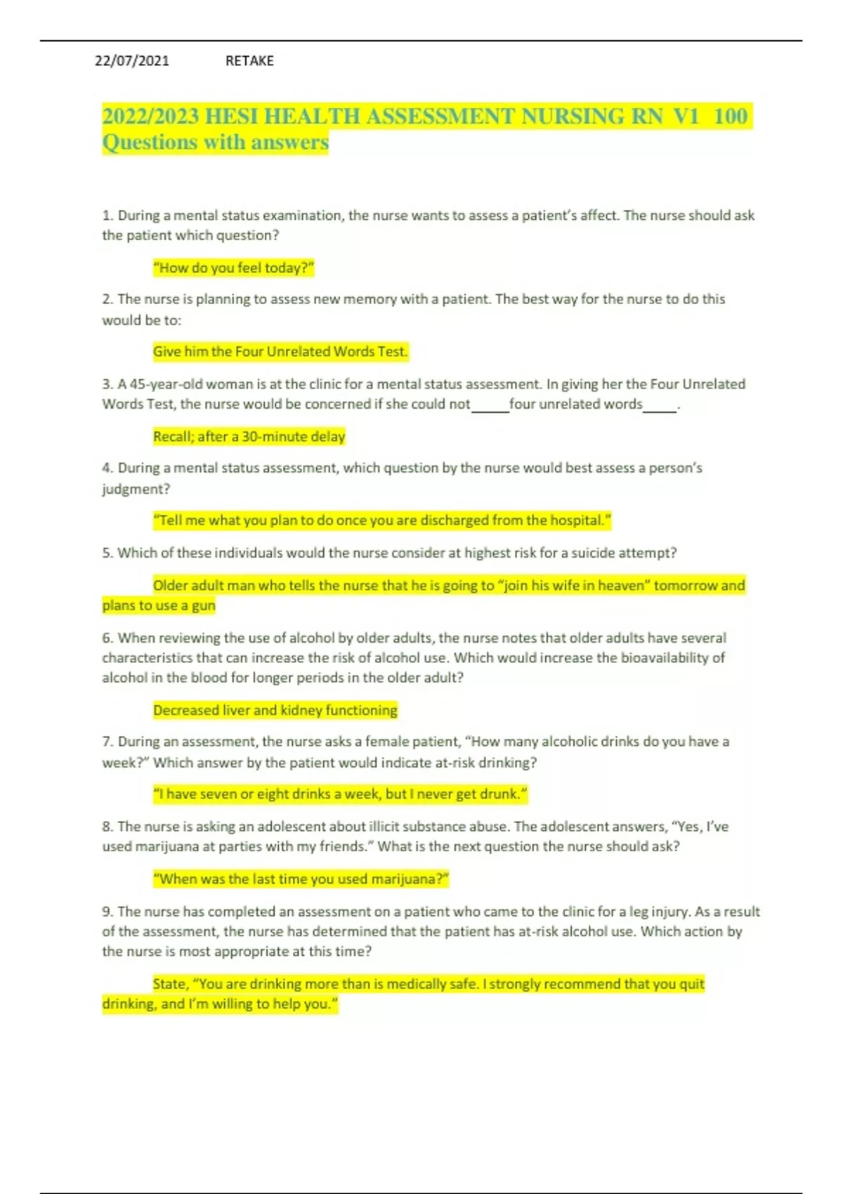 1. During a mental status examination, the nurse wants to assess a patient’s affect. The nurse should ask the patient which question? “How do you feel today?” 2. The nurse is planning to assess new memory with a patient. The best way for the nurse to do this would be to: Give him the Four Unrelated Words Test. 3. A 45-year-old woman is at the clinic for a mental status assessment. In giving her the Four Unrelated Words Test, the nurse would be concerned if she could not four unrelated words . Recall; after a 30-minute delay 4. During a mental status assessment, which question by the nurse would best assess a person’s judgment? “Tell me what you plan to do once you are discharged from the hospital.” 5. Which of these individuals would the nurse consider at highest risk for a suicide attempt? Older adult man who tells the nurse that he is going to “join his wife in heaven” tomorrow and plans to use a gun 6. When reviewing the use of alcohol by older adults, the nurse notes that older adults have several characteristics that can increase the risk of alcohol use. Which would increase the bioavailability of alcohol in the blood for longer periods in the older adult? Decreased liver and kidney functioning 7. During an assessment, the nurse asks a female patient, “How many alcoholic drinks do you have a week?” Which answer by the patient would indicate at-risk drinking? “I have seven or eight drinks a week, but I never get drunk.” 8. The nurse is asking an adolescent about illicit substance abuse. The adolescent answers, “Yes, I’ve used marijuana at parties with my friends.” What is the next question the nurse should ask? “When was the last time you used marijuana?” 9. The nurse has completed an assessment on a patient who came to the clinic for a leg injury. As a result of the assessment, the nurse has determined that the patient has at-risk alcohol use. Which action by the nurse is most appropriate at this time? State, “You are drinking more than is medically safe. I strongly recommend that you quit drinking, and I’m willing to help you.” 10. A patient is brought to the emergency department. He is restless, has dilated pupils, is sweating, has a runny nose and tearing eyes, and complains of muscle and joint pains. His girlfriend thinks he has influenza, but she became concerned when his temperature went up to 39.4° C. She admits that he has been a heavy drug user, but he has been trying to stop on his own. The nurse suspects that the patient is experiencing withdrawal symptoms from which substance? Heroin 11. Patient taking ipratropium reports nausea, blurred vision, has, insomnia after using the inhaler. RN action to implement - withhold med and report symptoms 12. A patient has suddenly developed shortness of breath and appears to be in significant respiratory distress. After calling the physician and placing the patient on oxygen, which of these actions is the best for the nurse to take when further assessing the patient? Bilaterally percuss the thorax, noting any differences in percussion tones. 13. The nurse is teaching a class on basic assessment skills. Which of these statements is true regarding the stethoscope and its use? Although the stethoscope does not magnify sound, it does block out extraneous room noise. 14. The nurse is preparing to use a stethoscope for auscultation. Which statement is true regarding the diaphragm of the stethoscope? The diaphragm: Is used to listen for high-pitched sounds. 15. Before auscultating the abdomen for the presence of bowel sounds on a patient, the nurse should: Check the temperature of the room, and offer blankets to the patient if he or she feels cold. ...................................................................................................CONTINUE