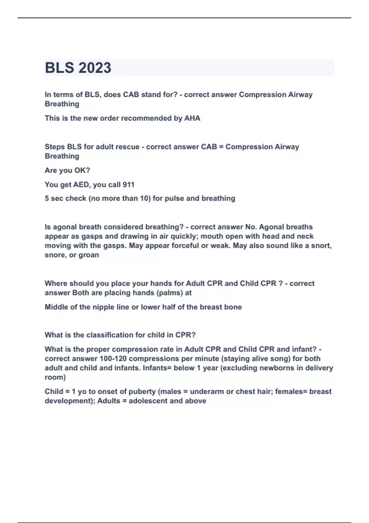 In terms of BLS, does CAB stand for? Compression Airway Breathing This is the new order recommended by AHA Steps BLS for adult rescue CAB = Compression Airway Breathing Are you OK? You get AED, you call 911 5 sec check (no more than 10) for pulse and breathing Is agonal breath considered breathing? No. Agonal breaths appear as gasps and drawing in air quickly; mouth open with head and neck moving with the gasps. May appear forceful or weak. May also sound like a snort, snore, or groan Where should you place your hands for Adult CPR and Child CPR ? Both are placing hands (palms) at Middle of the nipple line or lower half of the breast bone What is the classification for child in CPR? What is the proper compression rate in Adult CPR and Child CPR and infant? 100-120 compressions per minute (staying alive song) for both adult and child and infants. Infants= below 1 year (excluding newborns in delivery room) Child = 1 yo to onset of puberty (males = underarm or chest hair; females= breast development); Adults = adolescent and above What is the proper compression depth for Adult CPR and Child CPR and infant? There are some differences for compression depth for Adult and Child and Infant: For infants: 1/3 depth of chest, no more than 1.5 inches (4 cm) For a Child that would be about 1/3 depth of the chest, no more than 2 inches (5 cm) For adults: 2 inches but no more than 2.4 inches (5-6cm) For purposes of CPR, what is the classification for infant? Is the hand placement and compression depth different for infant? birth to 1 year (except for infants in delivery room) Use 2 fingers (instead of the palms)! Placement area is the same (between the nipples and lower area of breast bone) Compression depth is 1.5 inches (No more!) or 1/3 chest depth What is full chest recoil in CPR? Full chest recoil in CPR allows for the heart to fill up fully with blood What does it mean for compressions to be continuous? How do 2 people do chest compressions? Continuous chest compressions should be the goal Minimize interruptions and limit it to no more than 10 secs With 2 people providing chest compressions, each rotating every 2 minutes would be ideal CAB = Compression -Airway - Breath How would you position patient to ensure an open airway? For maintaining an open airway: Head tilt and chin lift IF there is suspected neck injury, you do NOT tilt head, you do a jaw thrust What is the compression to ventilation ratio? Compression to ventilation ratio is the number of compressions to breaths given to the patient For Adult, compression to ventilation ratio is 30:2 For Child and Infant with 1 rescuer, compression to ventilation ratio is 30:2 BUT... For infants and children with 2 rescuers, compression to ventilation ratio is 15:2 How often do you ventilate when an advanced airway when doing CPR? When using and advanced airway, Do NOT stop compressions. As you continue your compressions, you ventilate every 6 seconds (that's total of 10 ventilations per minute) Also Check for rise and fall of the chest When you receive the AED, use it immediately. How do you properly use and AED? Turn on the AED, follow it's instructions. AFTER making sure that everyone of cleared of the AED can you activate it according to its directions. The AED will determine if the patient needs defibrillation. How is the AED integrated into CPR? Continue chest compression as the AED is being delivered to you. Use it immediately Then if the AED states that CPR needs to continue, during the 30:2 compressions to breath, you use the AED during the "breath cycle" Can an AED be used on a person who was submerged in water? Can AED be used on a person lying in the snow? How about if a patient has a hairy chest? Yes, a person previously submerged in water, you wipe the water from the chest and place AED pads as usual. Yes, you can use an AED with a person lying in the snow - clear chest as usual. For a hair chest, you can shave it or place the pads firmly on the chest Are different size AED pads used on adults and children? Yes, pediatric pads are used on children age 8 and younger. If no pediatric pads are available, then you can use adult pads but make sure the pads do not touch. You may also place one the front of the chest and one on the back.