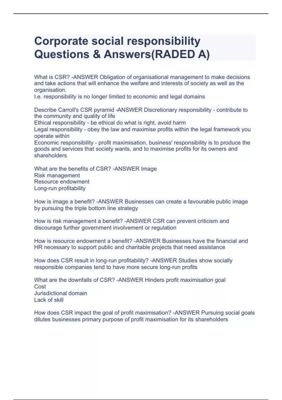 What is CSR? -ANSWER Obligation of organisational management to make decisions and take actions that will enhance the welfare and interests of society as well as the organisation. I.e. responsibility is no longer limited to economic and legal domains Describe Carroll's CSR pyramid -ANSWER Discretionary responsibility - contribute to the community and quality of life Ethical responsibility - be ethical do what is right, avoid harm Legal responsibility - obey the law and maximise profits within the legal framework you operate within Economic responsibility - profit maximisation, business' responsibility is to produce the goods and services that society wants, and to maximise profits for its owners and shareholders What are the benefits of CSR? -ANSWER Image Risk management Resource endowment
