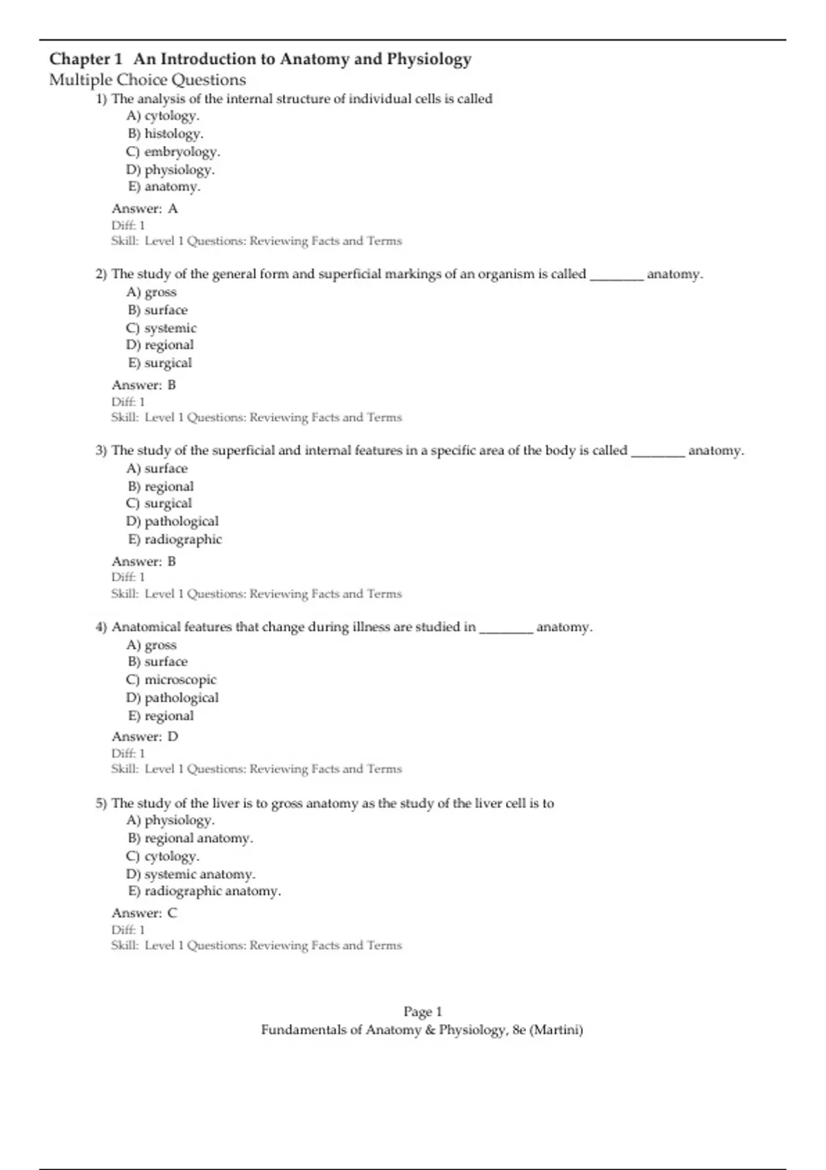 1) The analysis of the internal structure of individual cells is called A) cytology. B) histology. C) embryology. D) physiology. E) anatomy. Answer: A Diff: 1 Skill: Level 1 Questions: Reviewing Facts and Terms 2) The study of the general form and superficial markings of an organism is called anatomy. A) gross B) surface C) systemic D) regional E) surgical Answer: B Diff: 1 Skill: Level 1 Questions: Reviewing Facts and Terms 3) The study of the superficial and internal features in a specific area of the body is called anatomy. A) surface B) regional C) surgical D) pathological E) radiographic Answer: B Diff: 1 Skill: Level 1 Questions: Reviewing Facts and Terms 4) Anatomical features that change during illness are studied in anatomy. A) gross B) surface C) microscopic D) pathological E) regional Answer: D Diff: 1 Skill: Level 1 Questions: Reviewing Facts and Terms 5) The study of the liver is to gross anatomy as the study of the liver cell is to A) physiology. B) regional anatomy. C) cytology. D) systemic anatomy. E) radiographic anatomy. Answer: C Diff: 1 Skill: Level 1 Questions: Reviewing Facts and Terms 6) The study of the first two months of development is termed A) histology. B) embryology. C) cytology. D) pathology. E) organology. Answer: B Diff: 1 Skill: Level 1 Questions: Reviewing Facts and Terms 7) The study of the function of specific organ systems is called A) systemic physiology. B) organ physiology. C) cell physiology. D) pathological physiology. E) histology. Answer: A Diff: 1 Skill: Level 1 Questions: Reviewing Facts and Terms 8) Cardiovascular physiology is an example of A) histophysiology. B) organ physiology. C) systemic physiology. D) pathological physiology. E) physiological chemistry. Answer: C Diff: 1 Skill: Level 1 Questions: Reviewing Facts and Terms 9) Which of the following is arranged in correct order from the most COMPLEX to the SIMPLEST? A) cellular, tissue, molecular, system, organ, organism B) molecular, cellular, tissue, organ, system, organism C) tissue, cellular, molecular, organ, system, organism D) organ, organism, molecular, cellular, tissue, system E) organism, system, organ, tissue, cellular, molecular Answer: E Diff: 1 Skill: Level 1 Questions: Reviewing Facts and Terms 10) Which organ system provides support, protection of soft tissue, mineral storage, and blood formation? A) integumentary B) muscular C) skeletal D) nervous E) endocrine Answer: C Diff: 1 Skill: Level 1 Questions: Reviewing Facts and Terms 11) Which organ system transports nutrients, metabolic wastes, gases, and defense cells? A) cardiovascular B) digestive C) muscular D) respiratory E) urinary Answer: A Diff: 2 Skill: Level 1 Questions: Reviewing Facts and Terms 12) Which organ system includes the spleen and the tonsils? A) digestive B) endocrine C) nervous D) cardiovascular E) lymphatic Answer: E Diff: 2 Skill: Level 1 Questions: Reviewing Facts and Terms 13) The kidneys and ureters are organs of the system. A) endocrine B) digestive C) respiratory D) urinary E) lymphatic Answer: D Diff: 1 Skill: Level 1 Questions: Reviewing Facts and Terms 14) The pituitary gland and thyroid gland are organs of the system. A) endocrine B) cardiovascular C) respiratory D) lymphatic E) digestive Answer: A Diff: 1 Skill: Level 1 Questions: Reviewing Facts and Terms 15) Which organ system removes carbon dioxide from the bloodstream? A) cardiovascular B) lymphatic C) respiratory D) digestive E) endocrine Answer: C ..................................................................................................CONTINUE