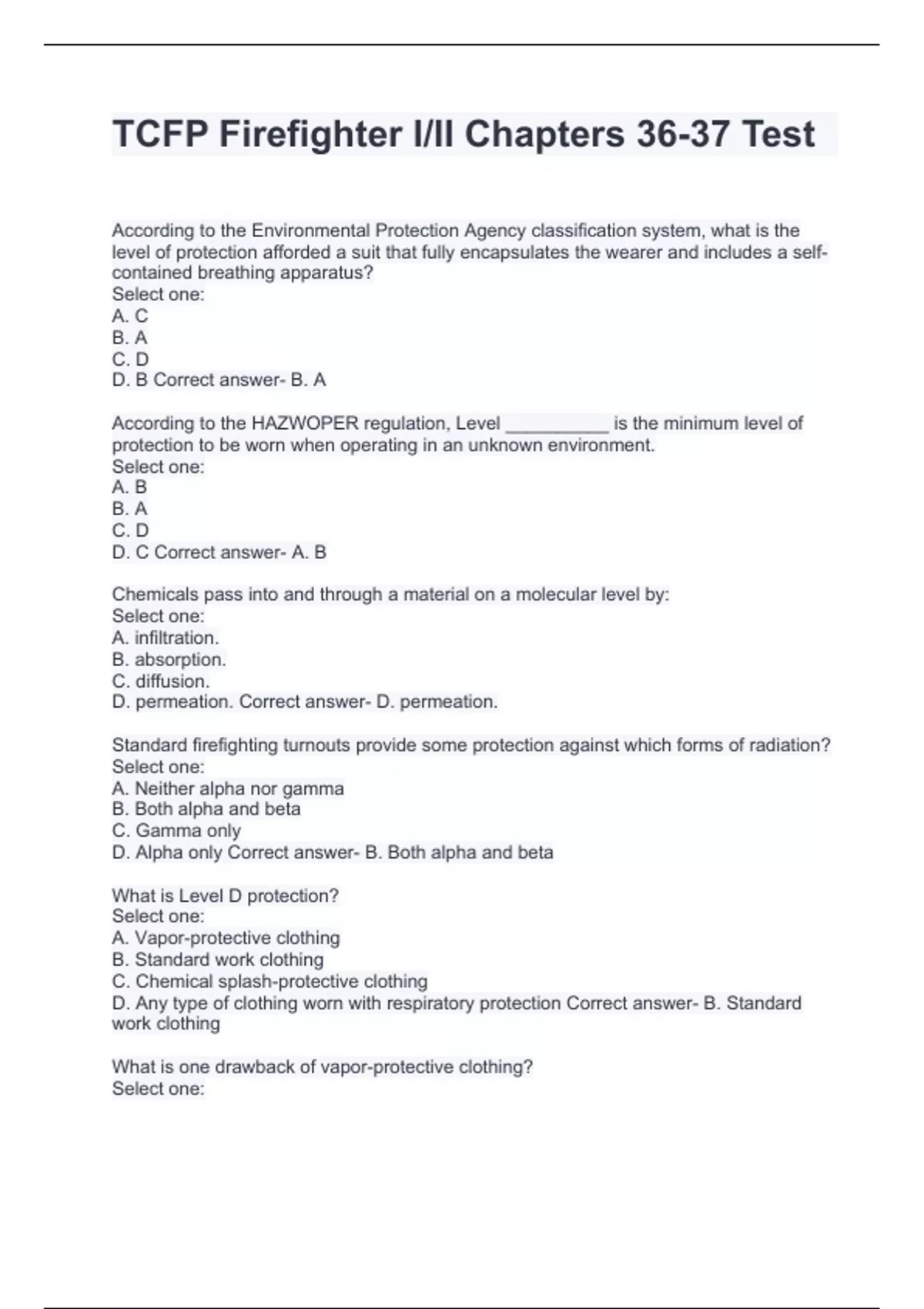 According to the Environmental Protection Agency classification system, what is the level of protection afforded a suit that fully encapsulates the wearer and includes a self-contained breathing apparatus? Select one: A. C B. A C. D D. B Correct answer- B. A According to the HAZWOPER regulation, Level __________ is the minimum level of protection to be worn when operating in an unknown environment. Select one: A. B B. A C. D D. C Correct answer- A. B