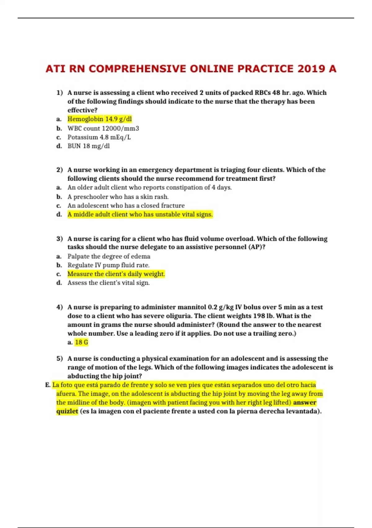 ATI RN COMPREHENSIVE ONLINE PRACTICE 2019 A 1) A nurse is assessing a client who received 2 units of packed RBCs 48 hr. ago. Which of the following findings should indicate to the nurse that the therapy has been effective? a. Hemoglobin 14.9 g/dl b. WBC count 12000/mm3 c. Potassium 4.8 mEq/L d. BUN 18 mg/dl 2) A nurse working in an emergency department is triaging four clients. Which of the following clients should the nurse recommend for treatment first? a. An older adult client who reports constipation of 4 days. b. A preschooler who has a skin rash. c. An adolescent who has a closed fracture d. A middle adult client who has unstable vital signs. 3) A nurse is caring for a client who has fluid volume overload. Which of the following tasks should the nurse delegate to an assistive personnel (AP)? a. Palpate the degree of edema b. Regulate IV pump fluid rate. c. Measure the client’s daily weight. d. Assess the client’s vital sign.