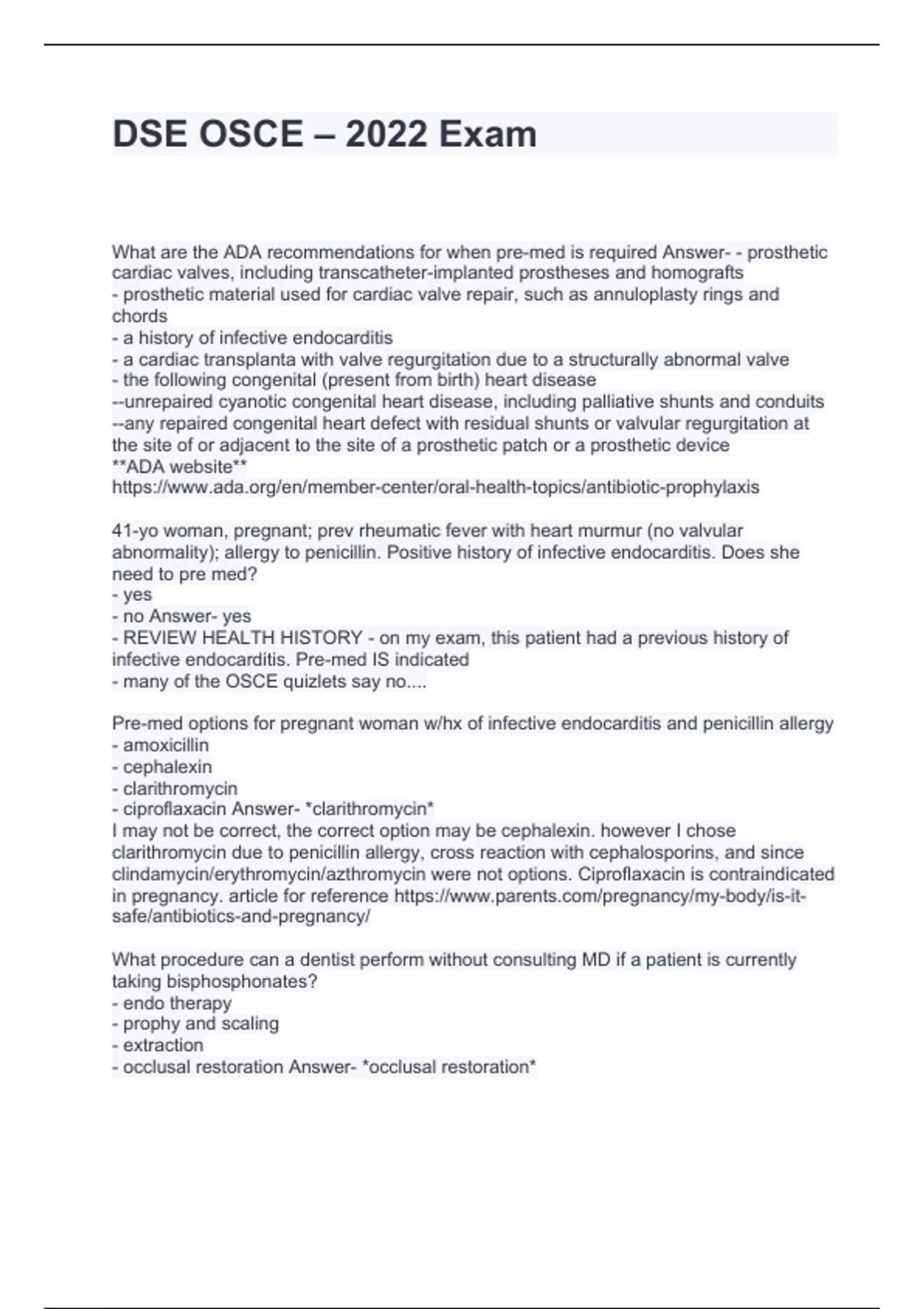 What are the ADA recommendations for when pre-med is required Answer- - prosthetic cardiac valves, including transcatheter-implanted prostheses and homografts - prosthetic material used for cardiac valve repair, such as annuloplasty rings and chords - a history of infective endocarditis - a cardiac transplanta with valve regurgitation due to a structurally abnormal valve - the following congenital (present from birth) heart disease --unrepaired cyanotic congenital heart disease, including palliative shunts and conduits --any repaired congenital heart defect with residual shunts or valvular regurgitation at the site of or adjacent to the site of a prosthetic patch or a prosthetic device **ADA website**