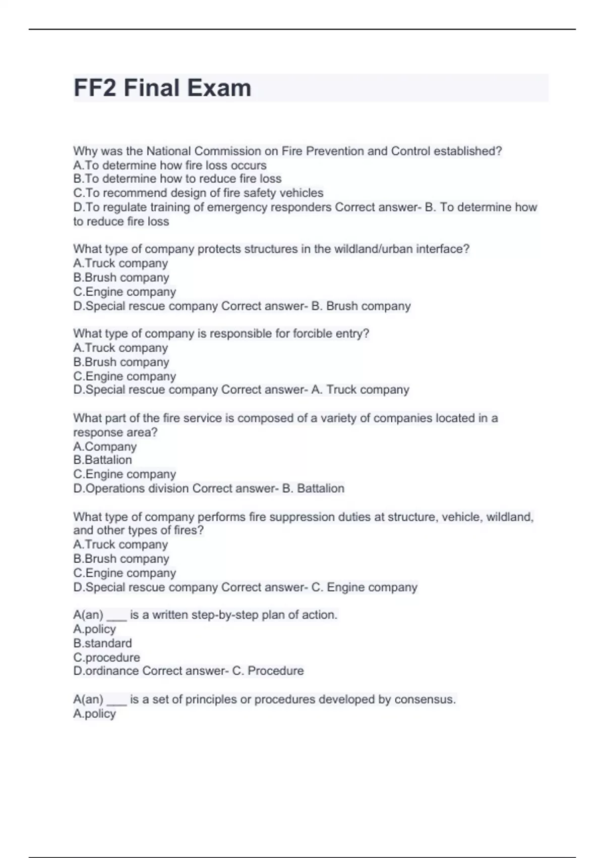 Why was the National Commission on Fire Prevention and Control established? A.To determine how fire loss occurs B.To determine how to reduce fire loss C.To recommend design of fire safety vehicles D.To regulate training of emergency responders Correct answer- B. To determine how to reduce fire loss What type of company protects structures in the wildland/urban interface? A.Truck company B.Brush company C.Engine company D.Special rescue company Correct answer- B. Brush company
