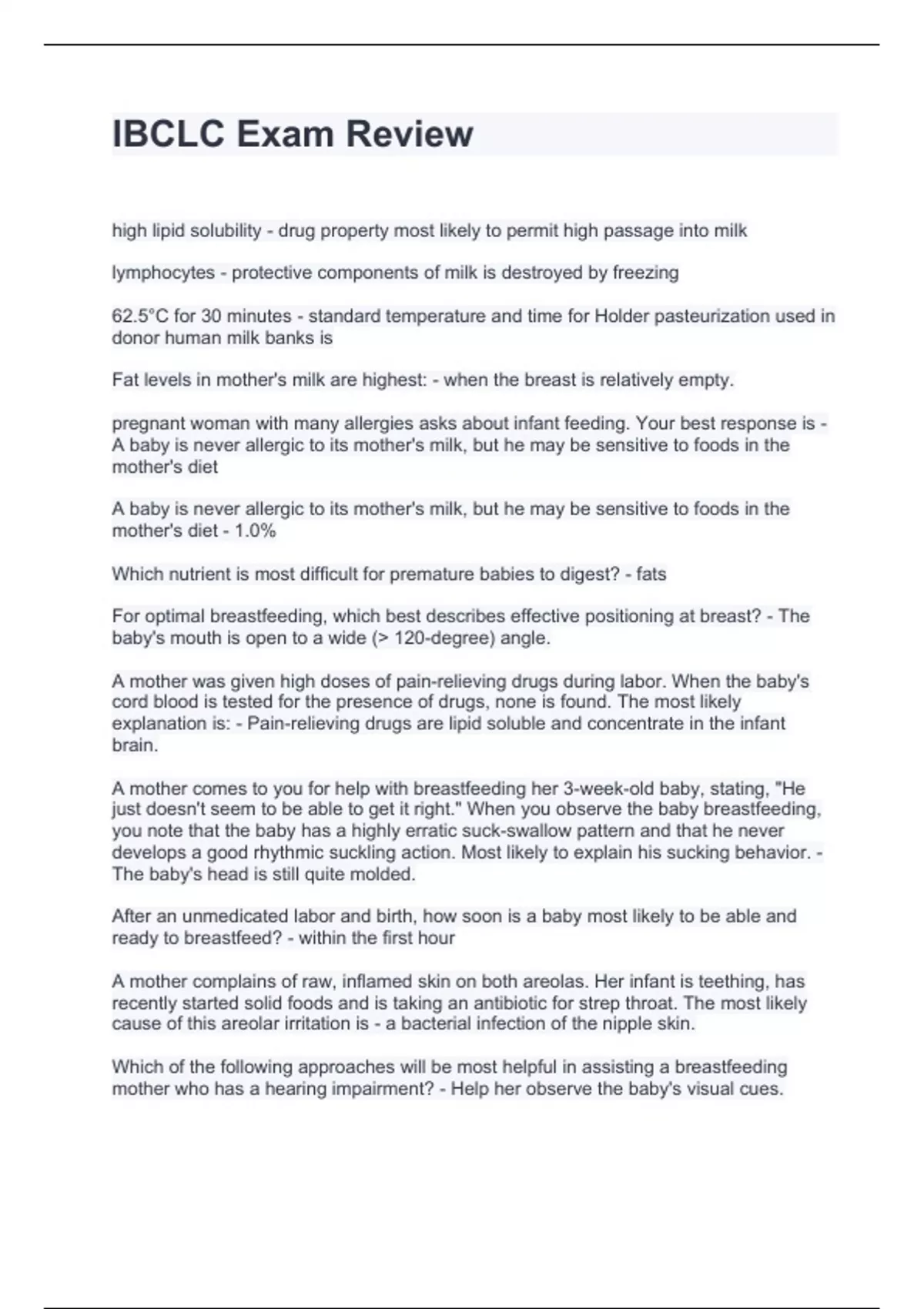 high lipid solubility - drug property most likely to permit high passage into milk lymphocytes - protective components of milk is destroyed by freezing 62.5°C for 30 minutes - standard temperature and time for Holder pasteurization used in donor human milk banks is