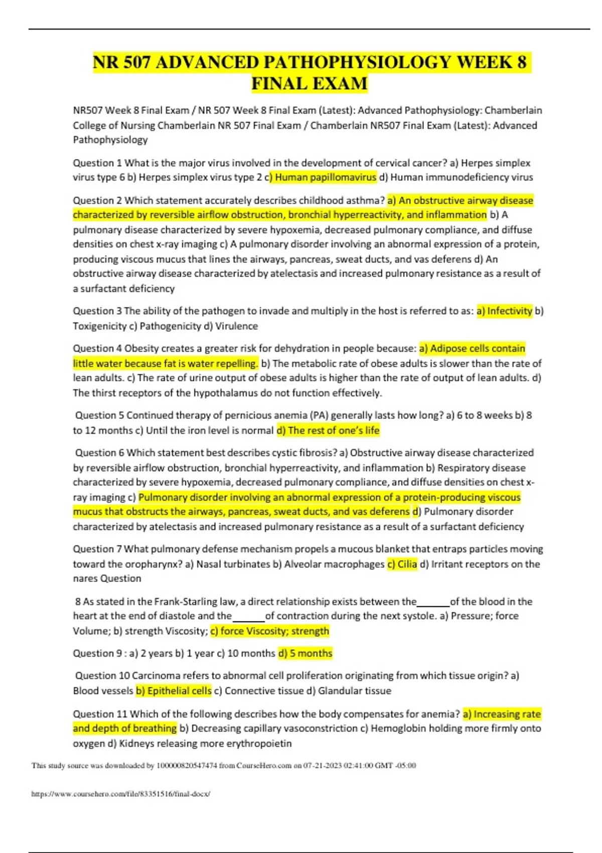 NR507 Week 8 Final Exam / NR 507 Week 8 Final Exam (Latest): Advanced Pathophysiology: ChamberlainCollege of Nursing Chamberlain NR 507 Final Exam / Chamberlain NR507 Final Exam (Latest): Advanced Pathophysiology