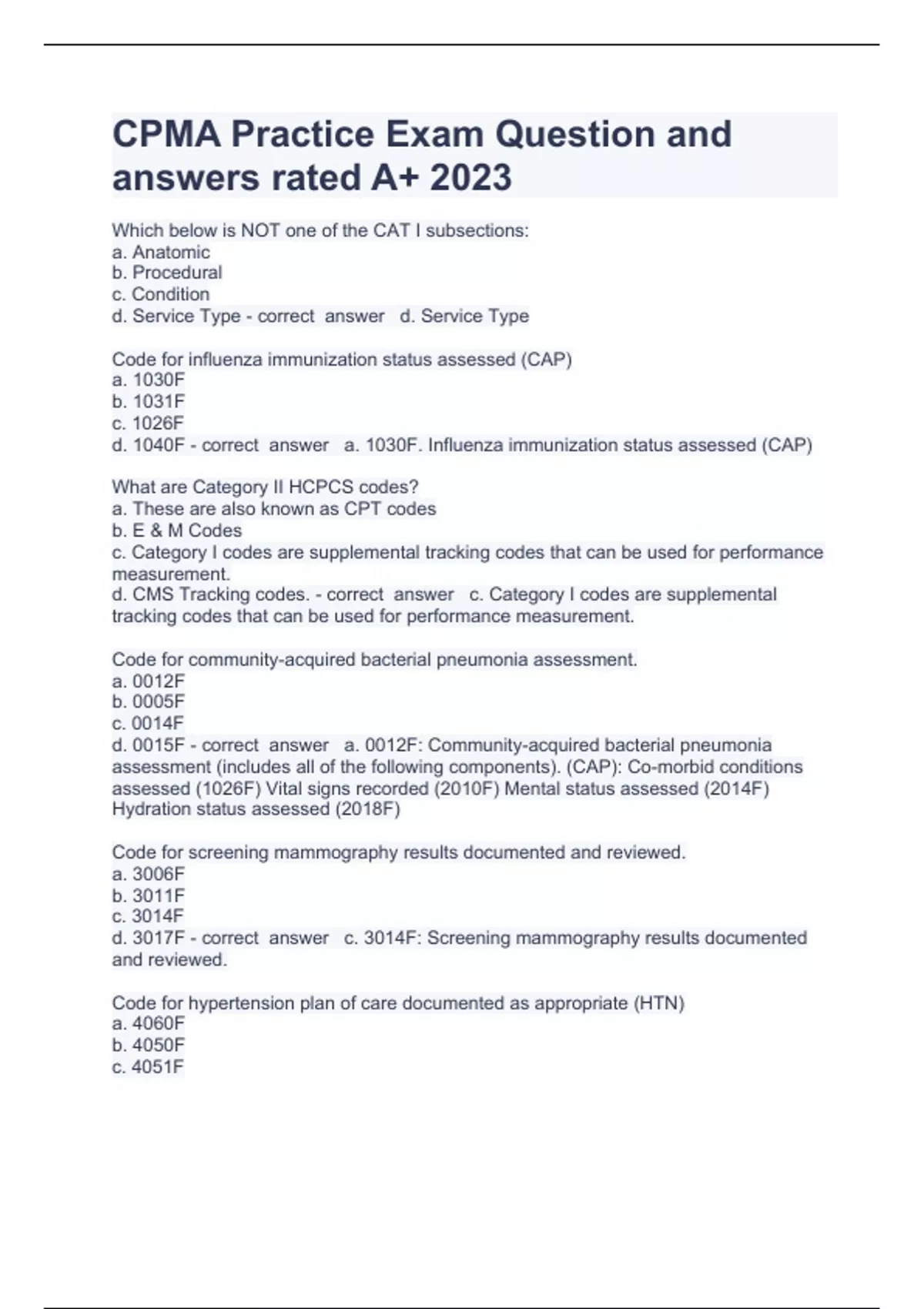 CPMA Practice Exam Question and answers rated A+ 2023 Which below is NOT one of the CAT I subsections: a. Anatomic b. Procedural c. Condition d. Service Type - correct answer d. Service Type Code for influenza immunization status assessed (CAP) a. 1030F b. 1031F c. 1026F d. 1040F - correct answer a. 1030F. Influenza immunization status assessed (CAP) What are Category II HCPCS codes? a. These are also known as CPT codes b. E & M Codes c. Category I codes are supplemental tracking codes that can be used for performance measurement. d. CMS Tracking codes. - correct answer c. Category I codes are supplemental tracking codes that can be used for performance