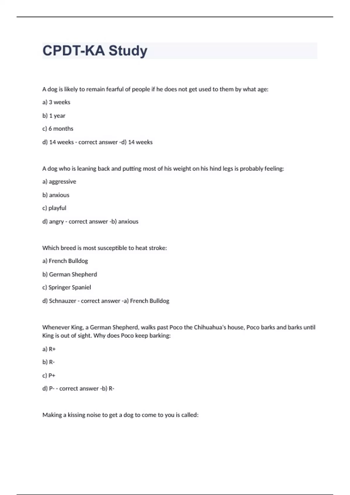 A dog is likely to remain fearful of people if he does not get used to them by what age: a) 3 weeks b) 1 year c) 6 months d) 14 weeks d) 14 weeks A dog who is leaning back and putting most of his weight on his hind legs is probably feeling: a) aggressive b) anxious c) playful d) angry b) anxious Which breed is most susceptible to heat stroke: a) French Bulldog b) German Shepherd c) Springer Spaniel d) Schnauzer a) French Bulldog Whenever King, a German Shepherd, walks past Poco the Chihuahua's house, Poco barks and barks until King is out of sight. Why does Poco keep barking: a) R+ b) R- c) P+ d) P- b) R- Making a kissing noise to get a dog to come to you is called: a) targeting b) shaping c) prompting d) capturing c) prompting Dogs who are aggressive toward other dogs have: a) predatory aggression b) intraspecific aggression c) territorial aggression d) possessive aggression b) intraspecific aggression Something the learner will work to avoid is considered a: a) reinforcer b) prong collar c) secondary reinforcer d) punisher d) punisher Meg's trainer has told her to give her dog a gentle tug on his choke chain whenever he starts to pull on the leash. This is: a) R+ b) R- c) P+ d) P- c) P+