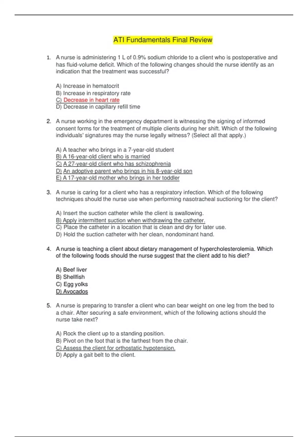 1. A nurse is administering 1 L of 0.9% sodium chloride to a client who is postoperative and has fluid-volume deficit. Which of the following changes should the nurse identify as an indication that the treatment was successful? A) Increase in hematocrit B) Increase in respiratory rate C) Decrease in heart rate D) Decrease in capillary refill time 2. A nurse working in the emergency department is witnessing the signing of informed consent forms for the treatment of multiple clients during her shift. Which of the following individuals' signatures may the nurse legally witness? (Select all that apply.) A) A teacher who brings in a 7-year-old student B) A 16-year-old client who is married C) A 27-year-old client who has schizophrenia D) An adoptive parent who brings in his 8-year-old son E) A 17-year-old mother who brings in her toddler 3. A nurse is caring for a client who has a respiratory infection. Which of the following techniques should the nurse use when performing nasotracheal suctioning for the client? A) Insert the suction catheter while the client is swallowing. B) Apply intermittent suction when withdrawing the catheter. C) Place the catheter in a location that is clean and dry for later use. D) Hold the suction catheter with her clean, nondominant hand. 4. A nurse is teaching a client about dietary management of hypercholesterolemia. Which of the following foods should the nurse suggest that the client add to his diet? A) Beef liver B) Shellfish C) Egg yolks D) Avocados 5. A nurse is preparing to transfer a client who can bear weight on one leg from the bed to a chair. After securing a safe environment, which of the following actions should the nurse take next? A) Rock the client up to a standing position. B) Pivot on the foot that is the farthest from the chair. C) Assess the client for orthostatic hypotension. D) Apply a gait belt to the client. 6. A nurse is caring for a group of clients. Which of the following actions should the nurse take to prevent the spread of infection? A) Carry a client's soiled linens out of the room in a mesh linen bag. B) Place a client who has tuberculosis in a room with negative-pressure airflow. C) Provide disposable plates and utensils for a client who is HIV-positive. D) Dispose of a client's blood-saturated dressing in a trash bag inside a second trash bag. 7. A nurse is caring for a client who does not speak the same language as the nurse. When working with the client through an interpreter, which of the following actions should the nurse take? A) Talk directly to the client, instead of the interpreter, when speaking. B) Use a family member as the client's interpreter. C) Make sure that the interpreter has a college degree. D) Avoid asking the client personal questions through the interpreter. 8. A nurse is caring for a client who has an indwelling urinary catheter. Which of the following assessment findings indicates that the catheter requires irrigation? A) Urine has an unusual odor. B) Urine specific gravity is 1.035. C) Bladder scan shows 525 mL of urine. D) Urine is positive for ketones. 9. A nurse is caring for a client who has diarrhea due to shigella. Which of the following precautions should the nurse take? A) Have the client wear a mask when receiving visitors. B) Wash her hands before and after contact with the client. C) Assign the client to a room with negative-pressure airflow exchange. D) Instruct all visitors to limit their time with the client. 10. A nurse on a medical unit is preparing to discharge a client to home. Which of the following actions should the nurse take as part of the medication reconciliation process? A) Seal unused hospital medications in a plastic bag. B) Evaluate the client's ability to self-administer medications. C) Report an identified discrepancy to The Joint Commission. D) Compare prescriptions with medications the client received during hospitalization. 11. A nurse is preparing to insert an IV catheter into a client's arm prior to initiating IV fluid therapy. Which of the following interventions should the nurse implement to prevent infection? A) Thread the IV catheter so that the hub rests at the insertion site. B) Shave excess hair from around the insertion site. C) Cleanse the site with hydrogen peroxide before IV catheter insertion. D) Palpate the site carefully just before inserting the IV catheter. 12. A nurse is caring for a client who needs to maintain a positive nitrogen balance for wound healing. Which of the following food items should the nurse recommend as a good source of complete protein? A) Oat cereal B) Refried beans C) Peanut butter D) Cheddar cheese 13. A nurse is providing discharge teaching to a client who has a new prescription for a home oxygen concentrator. Which of the following instructions should the nurse provide to the client and his family? (Select all that apply.) A) Check the cord routinely for frays or tearing. B) Keep the unit at least 4 feet away from a gas stove. C) Consider purchasing a generator for power backup. D) Observe for signs of hypoxia. E) Select synthetic clothing and bedding. 14. A nurse receives report about a client who has 0.9% sodium chloride infusing IV at 125 mL/hr. When the nurse performs the initial assessment, he notes that the client has received only 80 mL over the last 2 hr. Which of the following actions should the nurse take first? A) Reposition the client. B) Document the client's IV intake in the medical record. C) Request a new IV fluid prescription. D) Check the IV tubing for obstruction. 15. A nurse is planning care for a client who has fluid overload. Which of the following actions should the nurse plan to take first? A) Reduce dietary sodium B) Administer a loop diuretic C) Evaluate electrolytes D) Restrict intake of oral fluids ................................................................................................CONTINUE