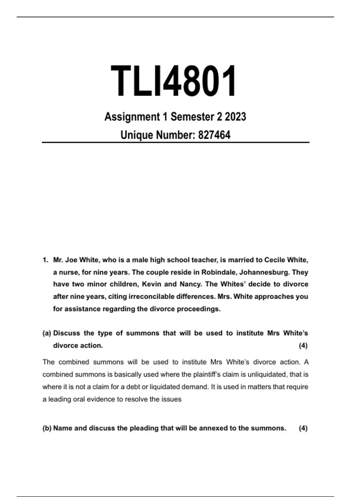 TLI4801 Assignment 1 Semester 2 - 2023 Mr. Joe White, who is a male high school teacher, is married to Cecile White, a nurse, for nine years. The couple reside in Robindale, Johannesburg. They have two minor children, Kevin and Nancy. The Whites’ decide to divorce after nine years, citing irreconcilable differences. Mrs. White approaches you for assistance regarding the divorce proceedings. (a) Discuss the type of summons that will be used to institute Mrs White’s divorce action. (4) (b) Name and discuss the pleading that will be annexed to the summons. (4) (c) Draft the prayer only. (4) 2. Discuss briefly how a legal practitioner may conduct an interview with a client in a litigation matter. (5) 3. On the morning of 2nd June 2023, a pedestrian Mr. Evans Blue, who is a member of a local hiking club “Fit Walkers”, is doing his morning walk on a public street in Pretoria. Suddenly, he is struck from behind by a speeding taxi driven by Speedy Gonzo, with registration number CN565GP. The accident takes place on Arcadia Street, Pretoria. Mr. Blue is injured as a result of the accident. Mr. Blue sustains the following injuries: a broken right leg, a broken pelvis, a deep cut below his right eye resulting in permanent facial scarring, bruises and abrasions to the right-hand side of his body. His doctors advise him that he will not be able to resume walking for a while as a result of his injuries. His injuries amount to R 850 000,00. Mr. Blue wants to institute a claim against Speedy Gonzo. He approaches you for legal advice. (a) Discuss whether the Road Accident Fund can be approached in this matter. (3) (b) Draft how the parties will be cited or described in the pleadings. (4) 4. Critically discuss the use of ‘practical vocational training’ in practice. [6]