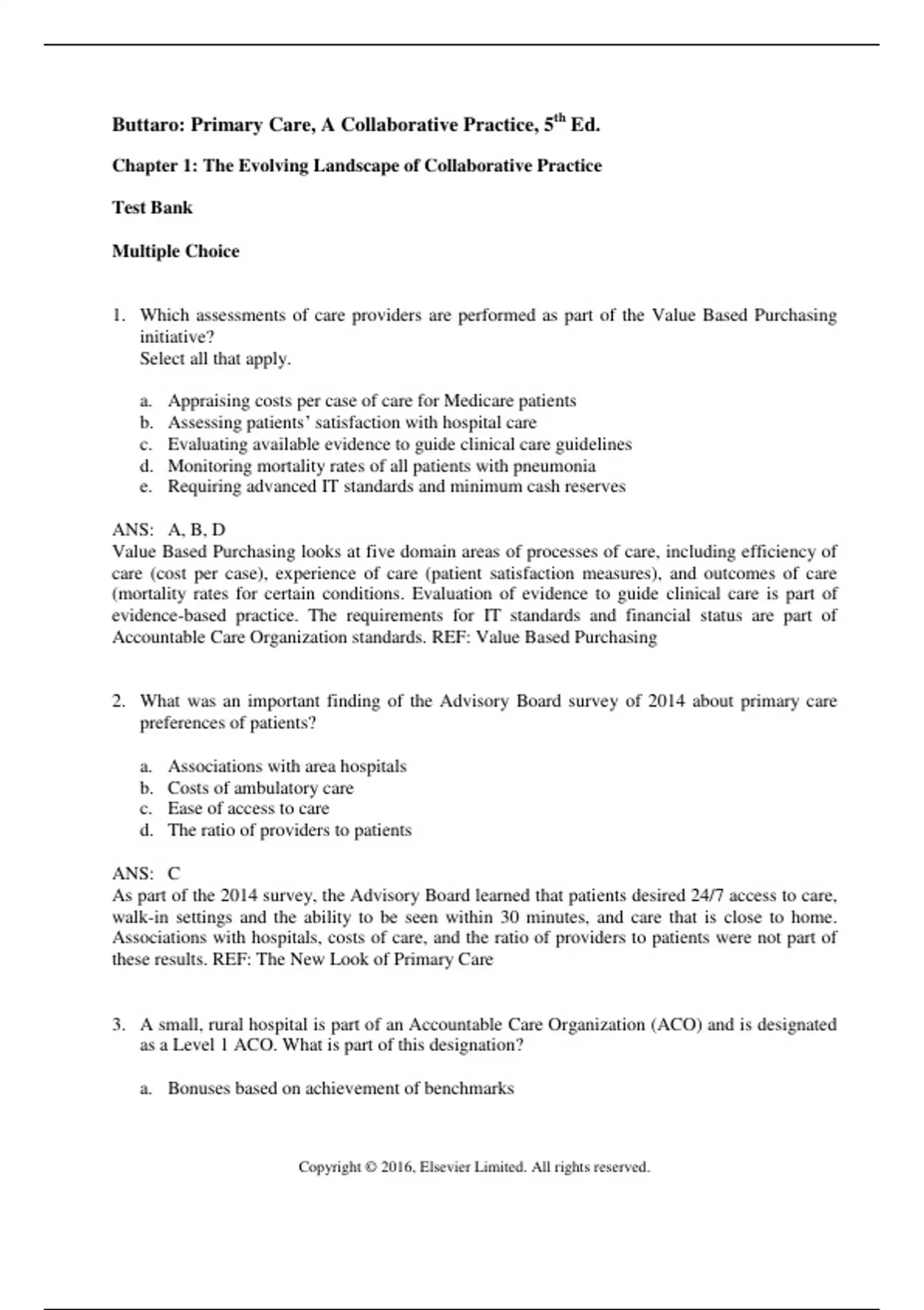 Test Bank For Primary Care: A Collaborative Practice 5th Edition By Terry Mahan Buttaro & JoAnn Trybulski & Patricia Polgar-Bailey & Joanne Sandberg-Cook 5193 5018 1 The Changing Landscape of Collaborative Practice 2 Transitional Care 3 Translating Research into Clinical Practice 4 The Patient, the Provider, and Primary Care 5 Population-Based Care for Primary Care Providers 6 Health Literacy, Health Care Disparities, and Culturally Responsive Primary Care 7 Genetic Considerations in Primary Care 8 Risk Management 9 Adolescent Issues 10 LGBTQ Patient Care 11 Pregnancy and Prenatal Care 12 Lactation Guidance 13 Aging and Common Geriatric Syndromes 14 Palliative and End-of-Life Care 15 Obesity and Weight Management 16 Lifestyle Management 17 Routine Health Screening and Immunizations 18 Principles of Occupational and Environmental Health in Primary Care 19 College Health 20 Health Care of the International Traveler 21 Presurgical Clearance 22 Preparticipation Sports Physical 23 Disaster and Emergency Preparedness and Response in Primary Care 24 Acute Bronchospasm 25 Anaphylaxis 26 Bites and Stings 27 Bradycardia and Tachycardia 28 Cardiac Arrest 29 Chemical Exposure 30 Electrical Injuries 31 Environmental and Food Allergies 32 Head Trauma 33 Hypotension 34 Poisoning 35 Sexual Assault 36 Syncope 37 Thermal Injuries 38 Examination of the Skin and Approach to Diagnosis of Skin Disorders 39 Surgical Office Procedures 40 Principles of Dermatologic Therapy 41 Screening for Skin Cancer 42 Acne Vulgaris 43 Alopecia 44 Animal and Human Bites 45 Bullous Pemphigoid 46 Burns (Minor) 47 Cellulitis 48 Contact Dermatitis 49 Corns and Calluses 50 Cutaneous Herpes 51 Dermatitis Medicamentosa (Drug Eruption) 52 Dry Skin 53 Eczematous Dermatitis (Atopic Dermatitis) 54 Fungal Infections (Superficial) 55 Herpes Zoster (Shingles) 56 Hidradenitis Suppurativa (Acne Inversa) 57 Hyperhidrosis 58 Intertrigo 59 Nail Disorders 60 Pigmentation Changes (Vitiligo) 61 Pruritus 62 Psoriasis 63 Purpura 64 Scabies 65 Seborrheic Dermatitis 66 Stasis Dermatitis 67 Urticaria 68 Warts 69 Wound Management 70 Evaluation of the Eyes 71 Cataracts 72 Blepharitis, Hordeolum, and Chalazion 73 Conjunctivitis 74 Corneal Surface Defects and Ocular Surface Foreign Bodies 75 Dry Eye Syndrome 76 Nasolacrimal Duct Obstruction and Dacryocystitis 77 Preseptal and Orbital Cellulitis 78 Pinguecula and Pterygium 79 Traumatic Ocular Disorders 80 Auricular Disorders 81 Cerumen Impaction 82 Cholesteatoma 83 Impaired Hearing 84 Inner Ear Disturbances 85 Otitis Externa 86 Otitis Media 87 Tympanic Membrane Perforation 88 Chronic Nasal Congestion and Discharge 89 Epistaxis 90 Nasal Trauma 91 Rhinitis 92 Sinusitis 93 Smell and Taste Disturbances 94 Tumors and Polyps of the Nose 95 Dental Abscess 96 Diseases of the Salivary Gland 97 Epiglottitis 98 Oral Infections 99 Parotitis 100 Peritonsillar Abscess 101 Pharyngitis and Tonsillitis 102 Acute Bronchitis 103 Asthma 104 Chest Pain (Noncardiac) 105 Chronic Cough 106 Chronic Obstructive Pulmonary Disease 107 Dyspnea 108 Hemoptysis 109 Lung Cancer 110 Pleural Effusions and Pleurisy 111 Pneumonia 112 Pneumothorax 113 Pulmonary Embolism 114 Pulmonary Hypertension 115 Sarcoidosis 116 Cardiac Diagnostic Testing 117 Abdominal Aortic Aneurysm 118 Cardiac Arrhythmias 119 Carotid Artery Disease 120 Chest Pain and Coronary Artery Disease 121 Heart Failure 122 Hypertension 123 Infective Endocarditis 124 Myocarditis 125 Peripheral Arterial and Venous Insufficiency 126 Valvular Heart Disease and Cardiac Murmurs 127 Abdominal Pain and Infections 128 Anorectal Complaints 129 Cholelithiasis and Cholecystitis 130 Cirrhosis 131 Constipation 132 Diarrhea, Noninfectious 133 Diverticular Disease 134 Dysphagia 135 Gastroesophageal Reflux Disease 136 Gastrointestinal Hemorrhage 137 Hepatitis 138 Inflammatory Bowel Disease 139 Irritable Bowel Syndrome 140 Jaundice 141 Nausea and Vomiting 142 Pancreatitis 143 Tumors of the Gastrointestinal Tract 144 Peptic Ulcer Disease 145 Incontinence 146 Prostate Cancer 147 Prostatic Hyperplasia (Benign) 148 Proteinuria and Hematuria 149 Renal Failure 150 Sexual Dysfunction (Male) 151 Testicular Disorders 152 Urinary Calculi 153 Urinary Tract Infections and Sexually Transmitted Infections 154 Uropathies (Obstructive) and Tumors of the Genitourinary Tract (Kidneys, Ureters, and Bladder) 155 Amenorrhea 156 Bartholin Gland Cysts and Abscesses 157 Breast Disorders 158 Chronic Pelvic Pain 159 Dysmenorrhea 160 Dyspareunia 161 Ectopic Pregnancy 162 Fertility Control 163 Genital Tract Cancers 164 Infertility 165 Menopause 166 Pap Test Abnormalities 167 Pelvic Inflammatory Disease 168 Sexual Dysfunction (Female) 169 Unplanned Pregnancy 170 Vulvar and Vaginal Disorders 171 Ankle and Foot Pain 172 Bone Tumors 173 Bursitis 174 Elbow Pain 175 Fibromyalgia and Myofascial Pain Syndrome 176 Gout 177 Hand and Wrist Pain 178 Hip Pain 179 Infectious Arthritis 180 Knee Pain 181 Low Back Pain 182 Metabolic Bone Disease 183 Neck Pain 184 Osteoarthritis 185 Osteomyelitis 186 Shoulder Pain 187 Sprains, Strains, and Fractures 188 Neuropsychological Evaluation 189 Amyotrophic Lateral Sclerosis 190 Bell Palsy 191 Cerebrovascular Events 192 Delirium 193 Dementia 194 Dizziness and Vertigo 195 Guillain-Barré Syndrome 196 Headache 197 Infections of the Central Nervous System 198 Movement Disorders and Essential Tremor 199 Multiple Sclerosis 200 Parkinson Disease 201 Seizure Disorder 202 Trigeminal Neuralgia 203 Intracranial Tumors 204 Acromegaly 205 Adrenal Gland Disorders 206 Diabetes Mellitus 207 Hirsutism 208 Hypercalcemia and Hypocalcemia 209 Hyperkalemia and Hypokalemia 210 Hypernatremia and Hyponatremia 211 Lipid Disorders 212 Metabolic Syndrome 213 Parathyroid Gland Disorders 214 Thyroid Disorders 215 Ankylosing Spondylitis and Related Disorders 216 Polymyalgia Rheumatica and Giant Cell Arteritis 217 Raynaud Phenomenon 218 Rheumatoid Arthritis 219 Systemic Lupus Erythematosus 220 Vasculitis 221 Barotrauma and Other Divi