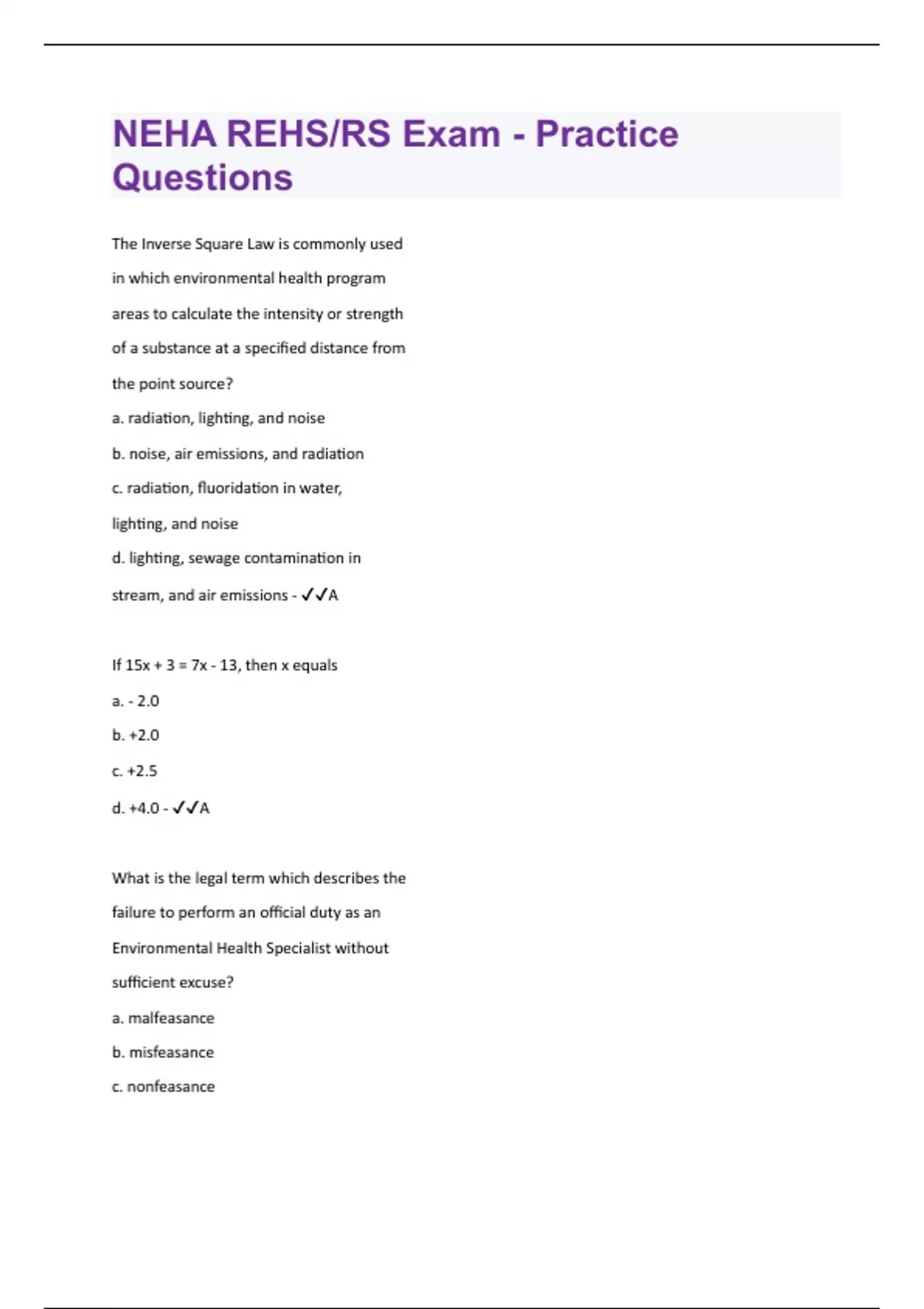 The Inverse Square Law is commonly used in which environmental health program areas to calculate the intensity or strength of a substance at a specified distance from the point source? a. radiation, lighting, and noise b. noise, air emissions, and radiation c. radiation, fluoridation in water, lighting, and noise d. lighting, sewage contamination in stream, and air emissions - A If 15x + 3 = 7x - 13, then x equals a. - 2.0 b. +2.0 c. +2.5 d. +4.0 - A What is the legal term which describes the failure to perform an official duty as an Environmental Health Specialist without sufficient excuse? a. malfeasance b. misfeasance c. nonfeasanced. criminal responsibility - C In the field of public health law, state government's police power is an attribute of a sovereign government; whereas, the federal government is a government of a. absolute police power. b. delegated police power. c. limited delegated powers. d. constitutional police power. - C