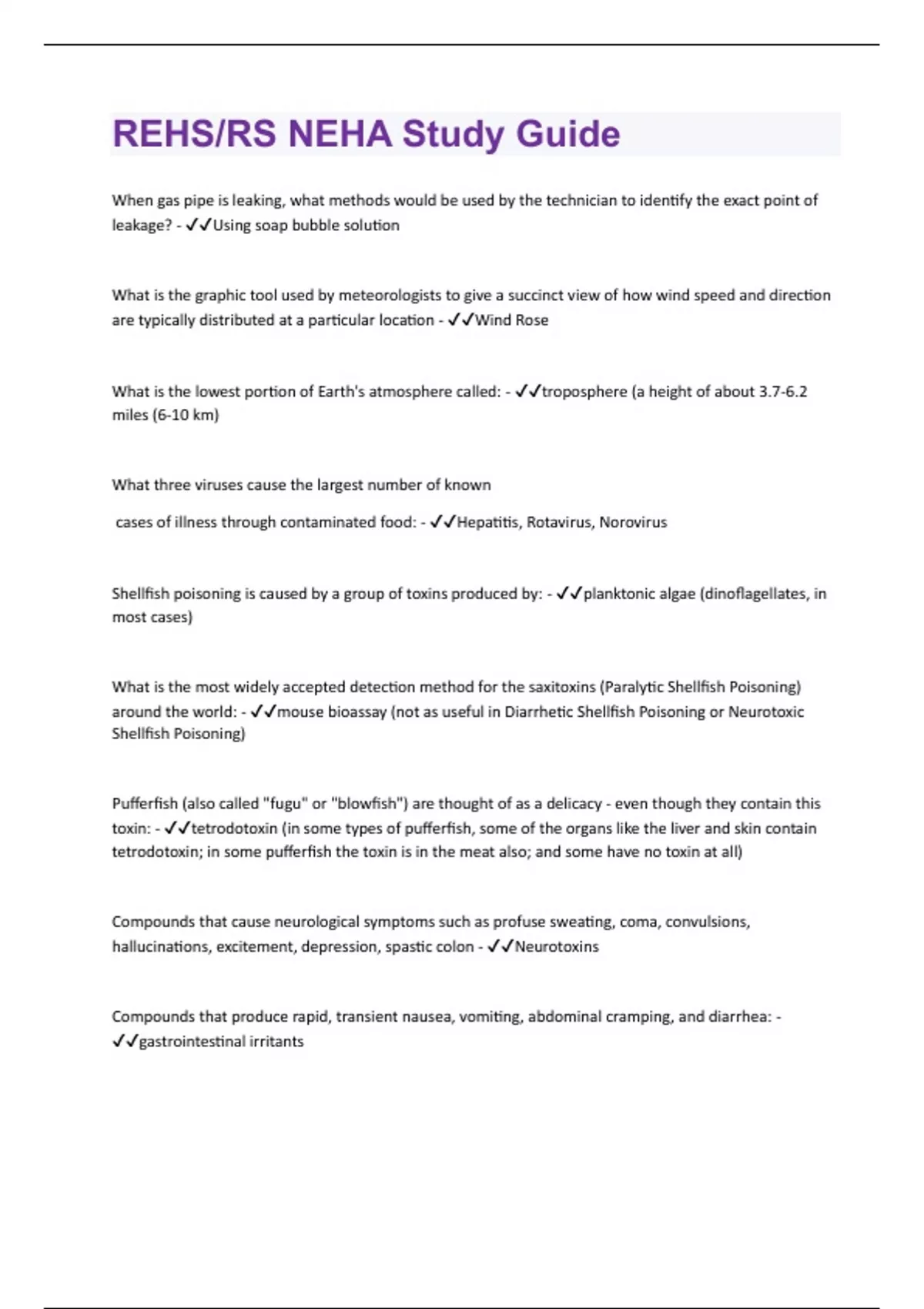 When gas pipe is leaking, what methods would be used by the technician to identify the exact point of leakage? - Using soap bubble solution What is the graphic tool used by meteorologists to give a succinct view of how wind speed and direction are typically distributed at a particular location - Wind Rose What is the lowest portion of Earth's atmosphere called: - troposphere (a height of about 3.7-6.2 miles (6-10 km) What three viruses cause the largest number of known cases of illness through contaminated food: - Hepatitis, Rotavirus, Norovirus Shellfish poisoning is caused by a group of toxins produced by: - planktonic algae (dinoflagellates, in most cases) What is the most widely accepted detection method for the saxitoxins (Paralytic Shellfish Poisoning) around the world: - mouse bioassay (not as useful in Diarrhetic Shellfish Poisoning or Neurotoxic Shellfish Poisoning) Pufferfish (also called "fugu" or "blowfish") are thought of as a delicacy - even though they contain this toxin: - tetrodotoxin (in some types of pufferfish, some of the organs like the liver and skin contain tetrodotoxin; in some pufferfish the toxin is in the meat also; and some have no toxin at all) Compounds that cause neurological symptoms such as profuse sweating, coma, convulsions, hallucinations, excitement, depression, spastic colon - Neurotoxins Compounds that produce rapid, transient nausea, vomiting, abdominal cramping, and diarrhea: - gastrointestinal irritants