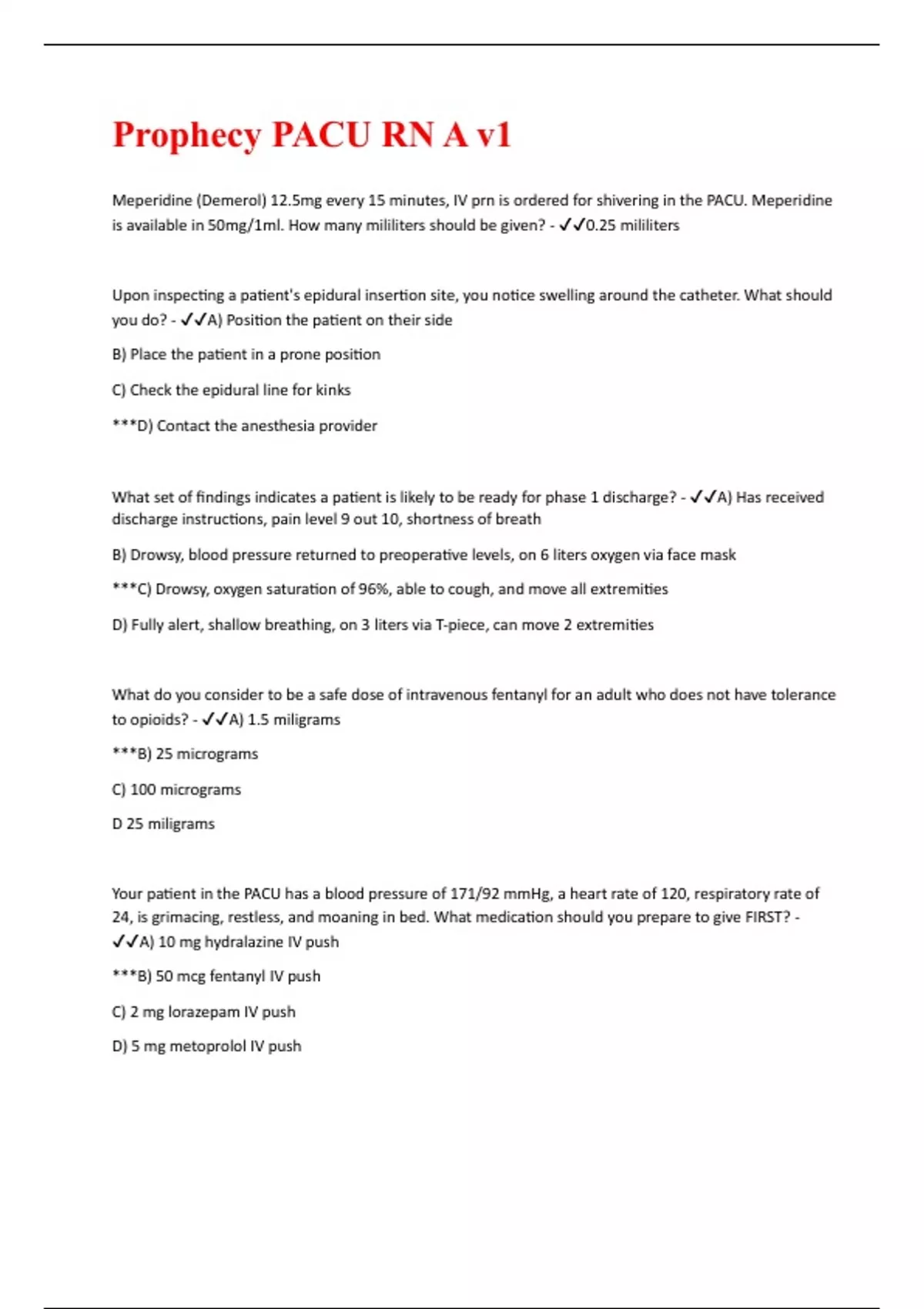 Meperidine (Demerol) 12.5mg every 15 minutes, IV prn is ordered for shivering in the PACU. Meperidine is available in 50mg/1ml. How many mililiters should be given? - 0.25 mililiters Upon inspecting a patient's epidural insertion site, you notice swelling around the catheter. What should you do? - A) Position the patient on their side B) Place the patient in a prone position C) Check the epidural line for kinks ***D) Contact the anesthesia provider What set of findings indicates a patient is likely to be ready for phase 1 discharge? - A) Has received discharge instructions, pain level 9 out 10, shortness of breath B) Drowsy, blood pressure returned to preoperative levels, on 6 liters oxygen via face mask ***C) Drowsy, oxygen saturation of 96%, able to cough, and move all extremities D) Fully alert, shallow breathing, on 3 liters via T-piece, can move 2 extremities What do you consider to be a safe dose of intravenous fentanyl for an adult who does not have tolerance to opioids? - A) 1.5 miligrams ***B) 25 micrograms C) 100 micrograms D 25 miligrams Your patient in the PACU has a blood pressure of 171/92 mmHg, a heart rate of 120, respiratory rate of 24, is grimacing, restless, and moaning in bed. What medication should you prepare to give FIRST? - A) 10 mg hydralazine IV push ***B) 50 mcg fentanyl IV push C) 2 mg lorazepam IV push D) 5 mg metoprolol IV pushYou are about to discharge a day surgery patient with aphasia and you discover the family members are not available for the discharge instructions and are not responding to your phone calls. Business hours are over and the PACU is about to close. How will you handle the situation? - ***A) Wait until the family returns B) Leave the discharge education on voicemail and discharge patient C) Discharge patient with non-emergency transport D) Take patient home yourself You received a patient from OR post hip replacement surgery. The anesthesiologist is planning a nerve block in PACU, but the patient did not sign the consent for the nerve block. How will you proceed? - A) Wake up the patient to sign the consent B) Ask a friend to sign the consent ***C) Obtain the consent from medical POA D) Proceed with the procedure What position would help alleviate headaches after spinal anesthesia? - A) Prone B) Trendelenburg C) Semi-fowlers ***D) Flat to supine ***WRONG*** What is a physical manifestation of neuromuscular blockade (Roc, succinylcholine)? - A) Decreased consciousness B) Decreased pupillary light reflex C) Decreased respiratory effort ***WRONG***D) Decreased sensation of pain The surgeon has ordered ampicillin (Ancef) for a patient. When you check their chart, you see an allergy to penicillin. What is the BEST action? - A) Administer the medication with diphenhydramine B) Ask the patient to describe their reaction to penicillin C) Contact the pharmacist to clarify the order***D) Contact the provider to question the order You are receiving report for a patient who had a percutaneous transluminal angioplasty for right lower extremity peripheral vascular disease and is now recovering in the PACU. What type of surgical dressing do you expect to find for this patient? - A) JP drain sutured in place near the lateral calf B) Several small incisions in calf groin covered with gauze ***C) Clear dressing applied to the right groin D) 3 in incision on the right upper thigh with bulky dressing You are receiving a report on a post op patients from the OR nurse and during the report when you asked for clarifications, the OR nurse became angry, belligerent, and rude. She ended up not answering your question. How will you proceed? - ***A) Report the incident to your charge nurse B) Refuse to take the patient C) Take the report as she gave it to you D) Figure out the clarifications from computer ***WRONG***You are reviewing your orders for you 8 year-old patient that recently arrive in PACU. Which PRN pain order would you question? - A) IV acetaminophen (maybe??? bc super expensive???) B) PO acetaminophen C) PO ketorolac (maybe???? bc shows increased risk of bleeding than tylenol, and is oral, which maybe they're trying to avoid PO after surgery) ***WRONG***D) IV ketorolac