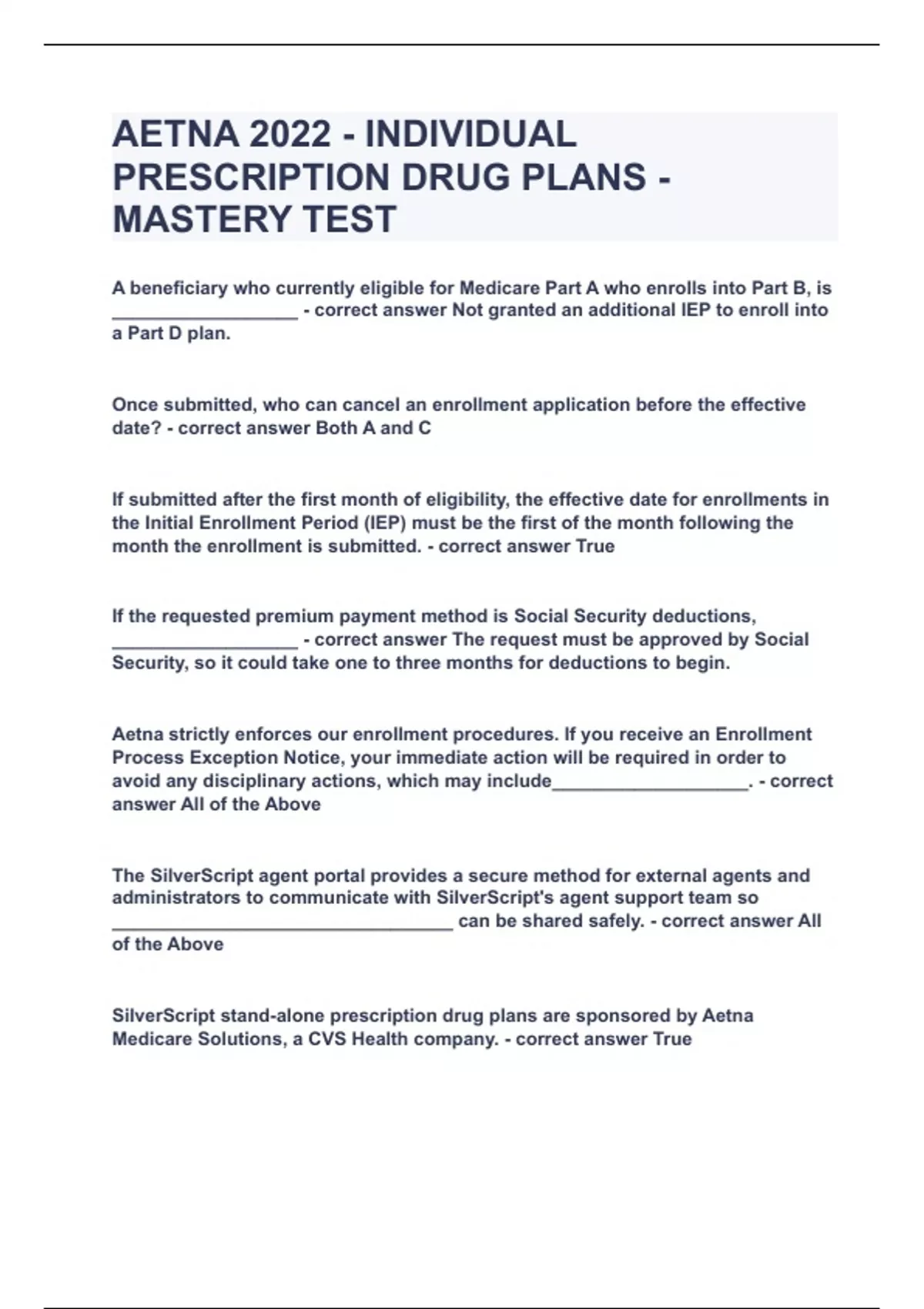 AETNA 2022 - INDIVIDUAL PRESCRIPTION DRUG PLANS - MASTERY TEST|UPDATED&VERIFIED|100% SOLVED|GUARANTEED SUCCESS