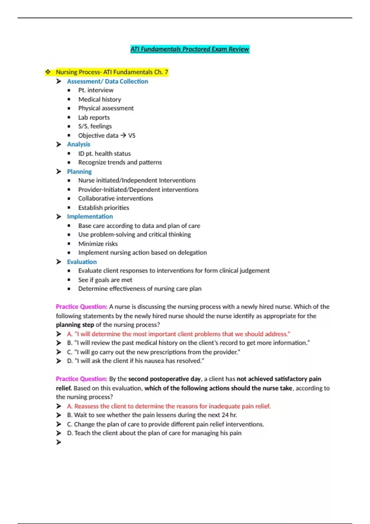 Practice Question: A nurse is discussing the nursing process with a newly hired nurse. Which of the following statements by the newly hired nurse should the nurse identify as appropriate for the planning step of the nursing process? A. “I will determine the most important client problems that we should address.” B. “I will review the past medical history on the client’s record to get more information.” C. “I will go carry out the new prescriptions from the provider.” D. “I will ask the client if his nausea has resolved.” Practice Question: By the second postoperative day, a client has not achieved satisfactory pain relief. Based on this evaluation, which of the following actions should the nurse take, according to the nursing process? A. Reassess the client to determine the reasons for inadequate pain relief. B. Wait to see whether the pain lessens during the next 24 hr. C. Change the plan of care to provide different pain relief interventions. D. Teach the client about the plan of care for managing his pain Medical and Surgical Sepsis- ATI Fundamentals Ch. 10 Hand Hygiene PRIMARY BEHAVIOR!!!!!! 3 essential components (at least 15 seconds and up to 2 minutes if more soiled) ▪ Soap ▪ Water ▪ Friction Must perform hand hygiene with either soap and water or alcohol-based product Alcohol based amount- usually 3-5mLs (rub until completely dry) If visible soiled= soap and water (2 min) Perform hand hygiene using recommended antiseptic solutions for immunocompromised or multi-drug resistant micro-organisms Personal Protective Equipment (PPE): ▪ Put on (or Don): Gown Mask Googles Gloves ▪ Take off (or Doff): Gloves Googles Gown Mask Physical Environment: ▪ Do not place items on the floor (even soiled laundry) ▪ Do not shake linens can spread microorganisms in the air • Keep from touch clothing keep away from you ▪ Clean LEAST soiled areas FIRST ▪ Use plastic bags for moist, soiled items ▪ Place specimens in biohazard containers Maintaining a Sterile Field: ▪ Prolonged exposure to airborne micro-organisms can make sterile items nonsterile. • Avoid coughing, sneezing, and talking directly over a sterile field. • Ask patients to refrain from touching supplies ▪ Only sterile items may be in a sterile field. • The outer wrappings and 1-inch edges of packaging that contains sterile items are not sterile. • Touch sterile materials only with sterile gloves ▪ Microbes can move by gravity from nonsterile item to a sterile item. • Do not reach across or above a sterile field. • Do not turn your back on a sterile field. • Hold items to add to a sterile field at a minimum of 6 inches above the field. ▪ Any sterile, non-waterproof wrapper that encounters moisture becomes nonsterile • Keep all surfaces dry. • Discard any sterile packages that are torn, punctured, or wet. Sterile Filed set up: ▪ First open flap or wrapper of packaging AWAY from you ▪ Next open SIDE flaps ▪ Last open last flap TOWARD your body Practice Question: A nurse is wearing sterile gloves in preparation for performing a sterile procedure. Which of the following objects can the nurse touch without breaching sterile technique? (Select all that apply.) A. a bottle containing a sterile solution B. The edge of the sterile drape at the base of the field C. The inner wrapping of an item on the sterile field D. An irrigation syringe on the sterile field E. One gloved hand with the other gloved hand Infection Control- ATI Fundamentals Ch. 11 Modes of transmission ▪ Contact • Direct contact- person to person • Indirect contact- inanimate object to person • Fecal-oral transmission- handling food without washing hands after using a restroom and failing to wash hands ▪ Droplet • Sneezing, coughing, and talking ▪ Airborne • Sneezing and coughing ▪ Vector-borne • Animal or insects (such as ticks with Lyme disease, mosquitos with West Nile Virus and Malaria) Chain of Infection ▪ Causative Agent Reservoir Portal of Exit Mode of Transmission Portal of entry Susceptible host Stages of Infection ▪ Incubation interval b/w pathogen entering the body and presentations of first finding ▪ Prodromal interval of onset of general findings to more distinct findings; pathogen multiplies ▪ Illness interval when findings specific to the infection occur ▪ Convalescence recovery Isolation Precautions ▪ Change PPE after contact with each client and between procedures with the same client Standard Precautions (Tier 1) ▪ Applies to all body fluids (except sweat), non-intact skin, and mucous membranes ▪ Perform hand hygiene ALWAYS!!!! Transmission Precautions (Tier 2) ▪ Airborne precautions • Private room, masks and respiratory devices, negative pressure airflow exchange • T- N95 or high-efficiency particulate air (HEPA) respirator • Wear mask while outside of room ◆ Measles, Varicella, TB ▪ Droplet precautions • Droplets larger than 5 mcg and travel 3-6 ft ◆ Haemophilus influenzae B, Rubella, Pertussis, Scarlet fever, mumps, mycoplasma pneumonia, sepsis • Private room with client with same infection • Masks for providers and visitors • Wear mask outside of room ▪ Contact precautions • Within 3 ft of client against direct and environmental contact • RSV, Shigella, Herpes simplex, impetigo, Scabies, multi-drug resistant organisms-MRSA, enteric organisms- C-Diff (From GI) • Private room with other clients with same infection • Gloves and gown worn by caregivers and visitors ▪ Protective precautions • To protect clients who are immunocompromised: stem cell transplant, chemo • Private room • Positive airflow 12 or more air exchanges/hr. • HEPA filter for incoming air • Mask for when patient is out of the room Multidrug-resistant Infection: ▪ Methicillin- resistant Staphylococcus aureus- MRSA • Resistant to many antimicrobials • Vancomycin and linezolid are used to treat MRSA ▪ Vancomycin-resistant Staphylococcus aureus- VR