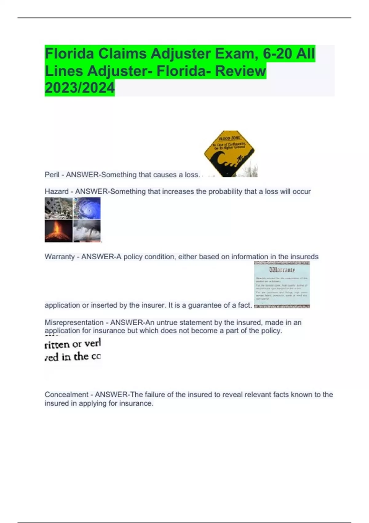 Florida Claims Adjuster Exam, 6-20 All Lines Adjuster- Florida- Review 2023/2024