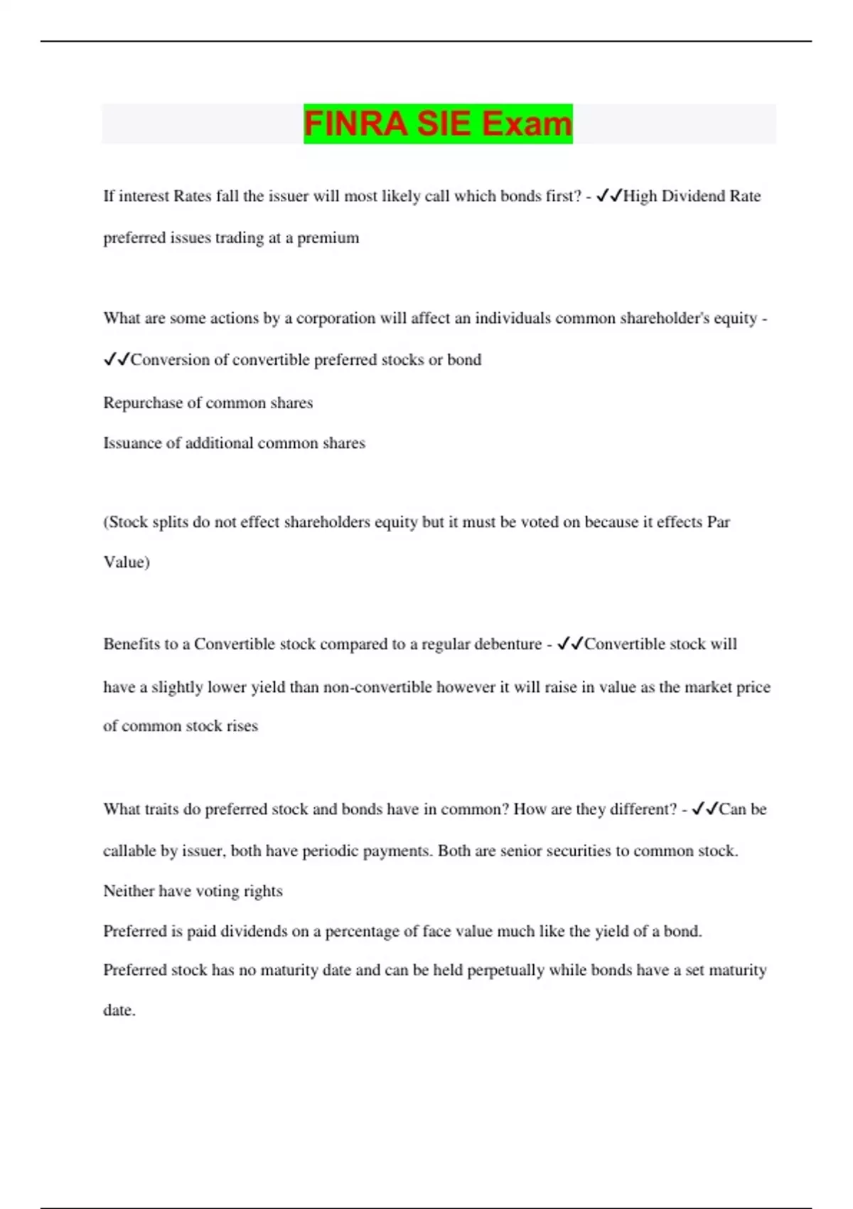 If interest Rates fall the issuer will most likely call which bonds first? - High Dividend Rate preferred issues trading at a premium What are some actions by a corporation will affect an individuals common shareholder's equity - Conversion of convertible preferred stocks or bond Repurchase of common shares Issuance of additional common shares (Stock splits do not effect shareholders equity but it must be voted on because it effects Par Value) Benefits to a Convertible stock compared to a regular debenture - Convertible stock will have a slightly lower yield than non-convertible however it will raise in value as the market price of common stock rises What traits do preferred stock and bonds have in common? How are they different? - Can be callable by issuer, both have periodic payments. Both are senior securities to common stock. Neither have voting rights Preferred is paid dividends on a percentage of face value much like the yield of a bond. Preferred stock has no maturity date and can be held perpetually while bonds have a set maturity date