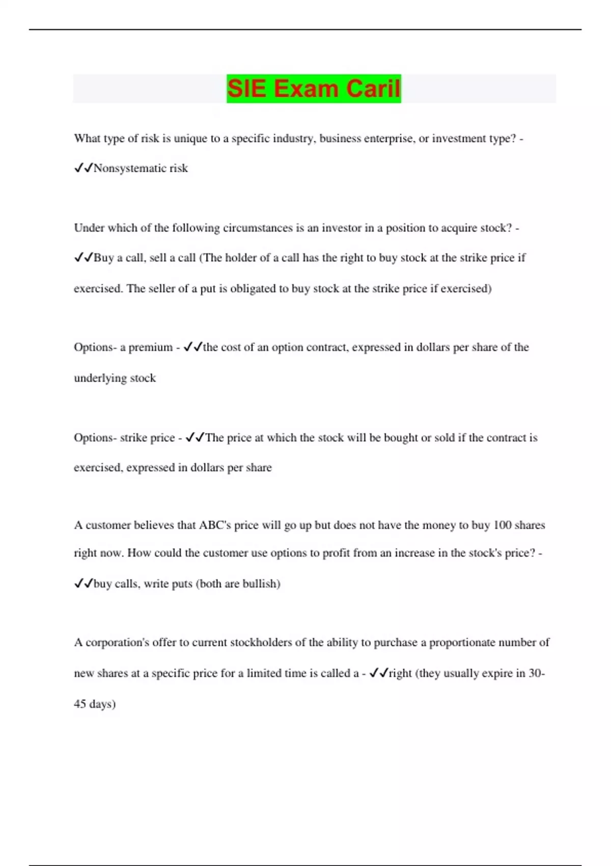 What type of risk is unique to a specific industry, business enterprise, or investment type? - Nonsystematic risk Under which of the following circumstances is an investor in a position to acquire stock? - Buy a call, sell a call (The holder of a call has the right to buy stock at the strike price if exercised. The seller of a put is obligated to buy stock at the strike price if exercised) Options- a premium - the cost of an option contract, expressed in dollars per share of the underlying stock Options- strike price - The price at which the stock will be bought or sold if the contract is exercised, expressed in dollars per share A customer believes that ABC's price will go up but does not have the money to buy 100 shares right now. How could the customer use options to profit from an increase in the stock's price? - buy calls, write puts (both are bullish) A corporation's offer to current stockholders of the ability to purchase a proportionate number of new shares at a specific price for a limited time is called a - right (they usually expire in 30- 45 days)
