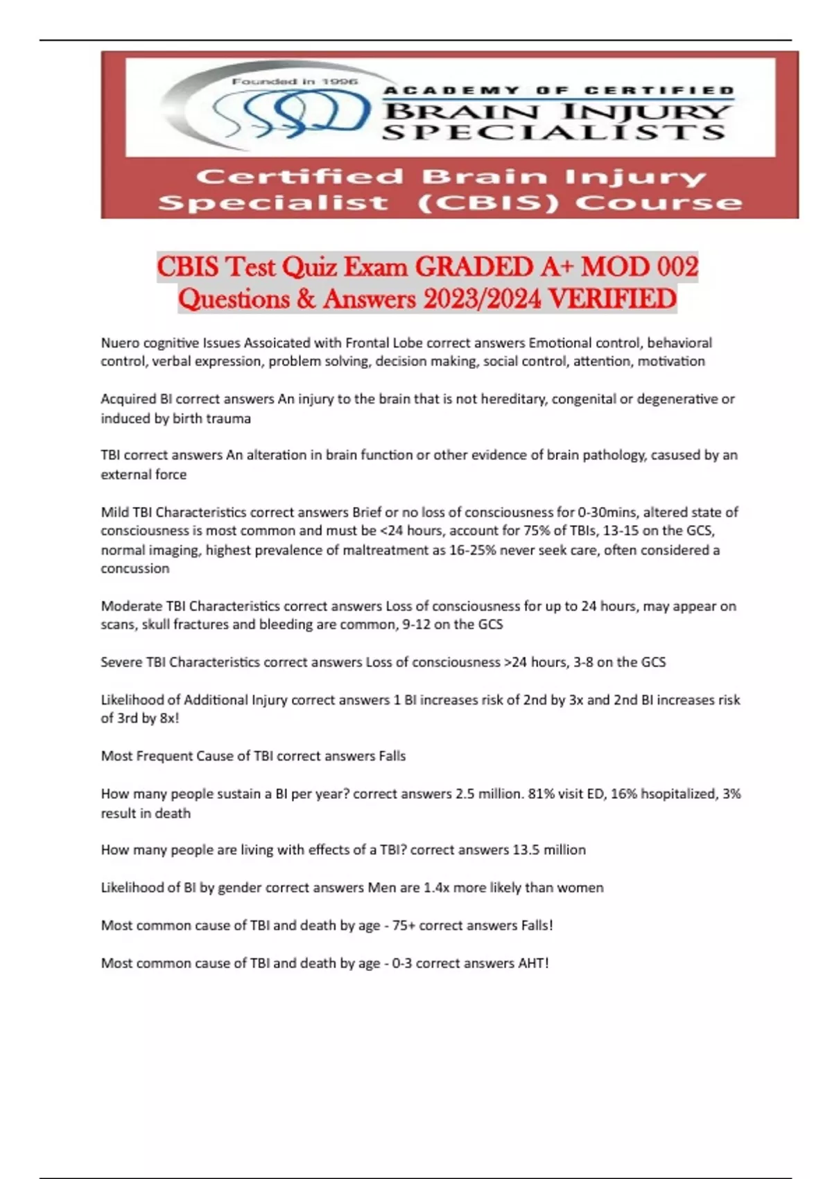 CBIS Test Quiz Exam GRADED A+ MOD 002 Questions & Answers 2023/2024 VERIFIED Nuero cognitive Issues Assoicated with Frontal Lobe correct answers Emotional control, behavioral control, verbal expression, problem solving, decision making, social control, attention, motivation Acquired BI correct answers An injury to the brain that is not hereditary, congenital or degenerative or induced by birth trauma TBI correct answers An alteration in brain function or other evidence of brain pathology, casused by an external force Mild TBI Characteristics correct answers Brief or no loss of consciousness for 0-30mins, altered state of consciousness is most common and must be <24 hours, account for 75% of TBIs, 13-15 on the GCS, normal imaging, highest prevalence of maltreatment as 16-25% never seek care, often considered a concussion Moderate TBI Characteristics correct answers Loss of consciousness for up to 24 hours, may appear on scans, skull fractures and bleeding are common, 9-12 on the GCS Severe TBI Characteristics correct answers Loss of consciousness >24 hours, 3-8 on the GCS Likelihood of Additional Injury correct answers 1 BI increases risk of 2nd by 3x and 2nd BI increases risk of 3rd by 8x! Most Frequent Cause of TBI correct answers Falls How many people sustain a BI per year? correct answers 2.5 million. 81% visit ED, 16% hsopitalized, 3% result in death How many people are living with effects of a TBI? correct answers 13.5 million Likelihood of BI by gender correct answers Men are 1.4x more likely than women Most common cause of TBI and death by age - 75+ correct answers Falls! Most common cause of TBI and death by age - 0-3 correct answers AHT! Most common cause of TBI and death by age - 20-24 correct answers MVAs and Firearms Most common cause of TBI and death by age - 16-19 correct answers MVAs! CARF correct answers Accreditation agency for post acute BI programs, residential, outpatient, vocational, home and community, stroke and pediatric programs - ensures quality of services through requirements for accreditation and surveys Joint Commission correct answers Accreditation agency for hospital based programs, may accompany CARF accreditation, ensures quality of services through requirements for accreditation and surveys Olmsted Decison correct answers Supreme court case stimulated by two women living in a nursing home in Georgia for community inclusion - resulted in federal and state initiatives to improve and normalize community living Model Systems of Care 1987 correct answers Resulted in research projects for TBI by the NIDDR, established rehab facilities to provide care and complete clinical research in the process Symptoms of Mild TBI correct answers Headache, fatigue, seizures, nausea, numbness, poor sleep, light sensitivity, noise sensitivity, impaired hearing, blurred vision, dizziness, loss of balance, neurological abnormality, in attentiveness, decreased concentration, poor memory, impaired judgment, slow proccessing speed, executive dysfunction, depression, anxiety, agitation, irritability, aggression, impulsivity Primary causes of Mild TBI correct answers Traumatic intertial - brain moving inside skull Traumatic impact - head hits directly Early Treatment for Mild TBI correct answers Relaxation techniques, rest, slow return to normal activity, and reduction of normal activity if symptoms recur Peristent Post Concussive Symptoms (PPCS) correct answers Symptoms of Mild TBI last >1 month, occurs 10% of the time in Mild TBI cases Chronic Traumatic Encephalopathy (CTE) correct answers Often cause by repeated blows to the head, is a progressive, degenerative condition characterized by broken nuerons which continually release tau protein cashing dementia over time Diffuse axonal injury -> tau protein release -> inflammation of the brain -> progressive dementia Define Skull correct answers Bony shell that protects the brain, has bony prominences inside which can worsen brain injury