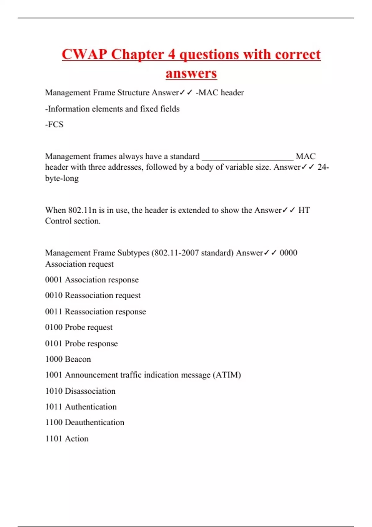 Management Frame Structure Answer -MAC header -Information elements and fixed fields -FCS Management frames always have a standard _____________________ MAC header with three addresses, followed by a body of variable size. Answer 24-byte-long When 802.11n is in use, the header is extended to show the Answer HT Control section. Management Frame Subtypes (802.11-2007 standard) Answer 0000 Association request 0001 Association response 0010 Reassociation request 0011 Reassociation response 0100 Probe request 0101 Probe response 1000 Beacon 1001 Announcement traffic indication message (ATIM) 1010 Disassociation 1011 Authentication 1100 Deauthentication 1101 Action