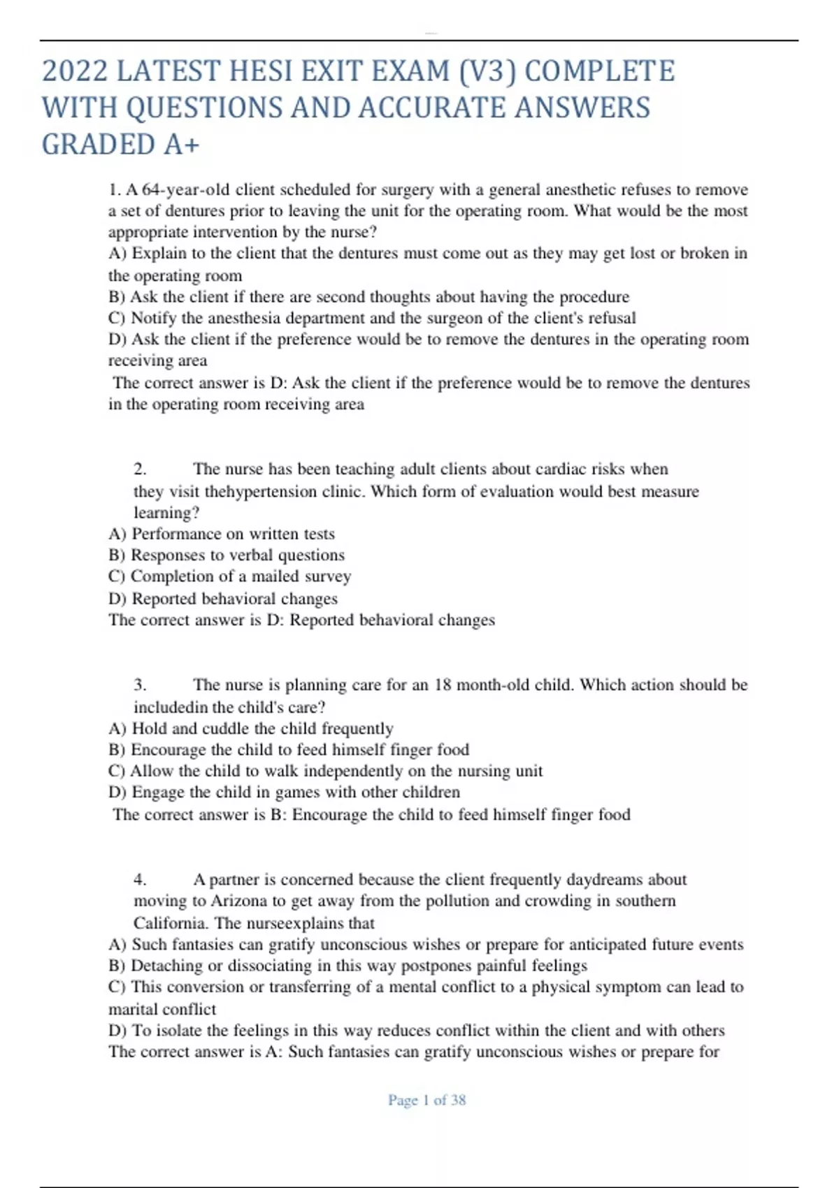 2022 LATEST HESI EXIT EXAM (V3) COMPLETE WITH QUESTIONS AND ACCURATE ANSWERS GRADED A+ 1. A 64-year-old client scheduled for surgery with a general anesthetic refuses to remove a set of dentures prior to leaving the unit for the operating room. What would be the most appropriate intervention by the nurse? A) Explain to the client that the dentures must come out as they may get lost or broken in the operating room B) Ask the client if there are second thoughts about having the procedure C) Notify the anesthesia department and the surgeon of the client's refusal D) Ask the client if the preference would be to remove the dentures in the operating room receiving area The correct answer