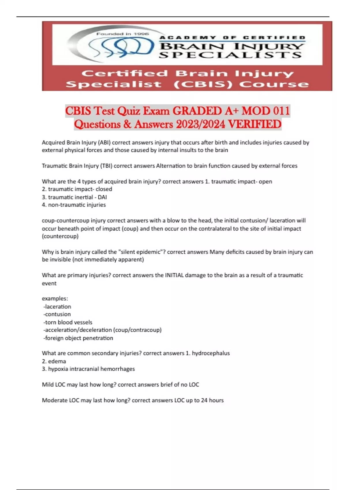 CBIS Test Quiz Exam GRADED A+ MOD 011 Questions & Answers 2023/2024 VERIFIED Acquired Brain Injury (ABI) correct answers injury that occurs after birth and includes injuries caused by external physical forces and those caused by internal insults to the brain Traumatic Brain Injury (TBI) correct answers Alternation to brain function caused by external forces What are the 4 types of acquired brain injury? correct answers 1. traumatic impact- open 2. traumatic impact- closed 3. traumatic inertial - DAI 4. non-traumatic injuries coup-countercoup injury correct answers with a blow to the head, the initial contusion/ laceration will occur beneath point of impact (coup) and then occur on the contralateral to the site of initial impact (countercoup) Why is brain injury called the "silent epidemic"? correct answers Many deficits caused by brain injury can be invisible (not immediately apparent) What are primary injuries? correct answers the INITIAL damage to the brain as a result of a traumatic event examples: -laceration -contusion -torn blood vessels -acceleration/deceleration (coup/contracoup) -foreign object penetration What are common secondary injuries? correct answers 1. hydrocephalus 2. edema 3. hypoxia intracranial hemorrhages Mild LOC may last how long? correct answers brief of no LOC Moderate LOC may last how long? correct answers LOC up to 24 hours Severe LOC may last how long? correct answers LOC greater than 24 hours List 5 risk factors for brain injury correct answers 1. Age (15-19, 20-24, 65+) 2. alcohol use 3. military action 4. domestic violence 5. prisons 6. sport-injury Age Groups with Highest Rates of Brain Injury due to Falls correct answers (0-4 years old) 50% of all TBIs