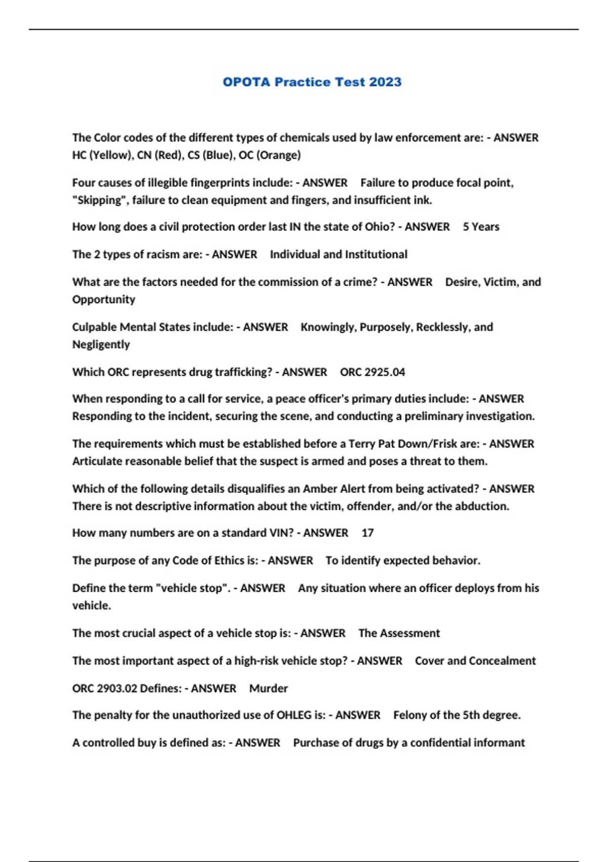 The Color codes of the different types of chemicals used by law enforcement are: - ANSWER HC (Yellow), CN (Red), CS (Blue), OC (Orange) Four causes of illegible fingerprints include: - ANSWER Failure to produce focal point, "Skipping", failure to clean equipment and fingers, and insufficient ink. How long does a civil protection order last IN the state of Ohio? - ANSWER 5 Years The 2 types of racism are: - ANSWER Individual and Institutional What are the factors needed for the commission of a crime? - ANSWER Desire, Victim, and Opportunity Culpable Mental States include: - ANSWER Knowingly, Purposely, Recklessly, and Negligently Which ORC represents drug trafficking? - ANSWER ORC 2925.04 When responding to a call for service, a peace officer's primary duties include: - ANSWER Responding to the incident, securing the scene, and conducting a preliminary investigation. The requirements which must be established before a Terry Pat Down/Frisk are: - ANSWER Articulate reasonable belief that the suspect is armed and poses a threat to them. Which of the following details disqualifies an Amber Alert from being activated? - ANSWER There is not descriptive information about the victim, offender, and/or the abduction. How many numbers are on a standard VIN? - ANSWER 17 The purpose of any Code of Ethics is: - ANSWER To identify expected behavior. Define the term "vehicle stop". - ANSWER Any situation where an officer deploys from his vehicle. The most crucial aspect of a vehicle stop is: - ANSWER The Assessment The most important aspect of a high-risk vehicle stop? - ANSWER Cover and Concealment