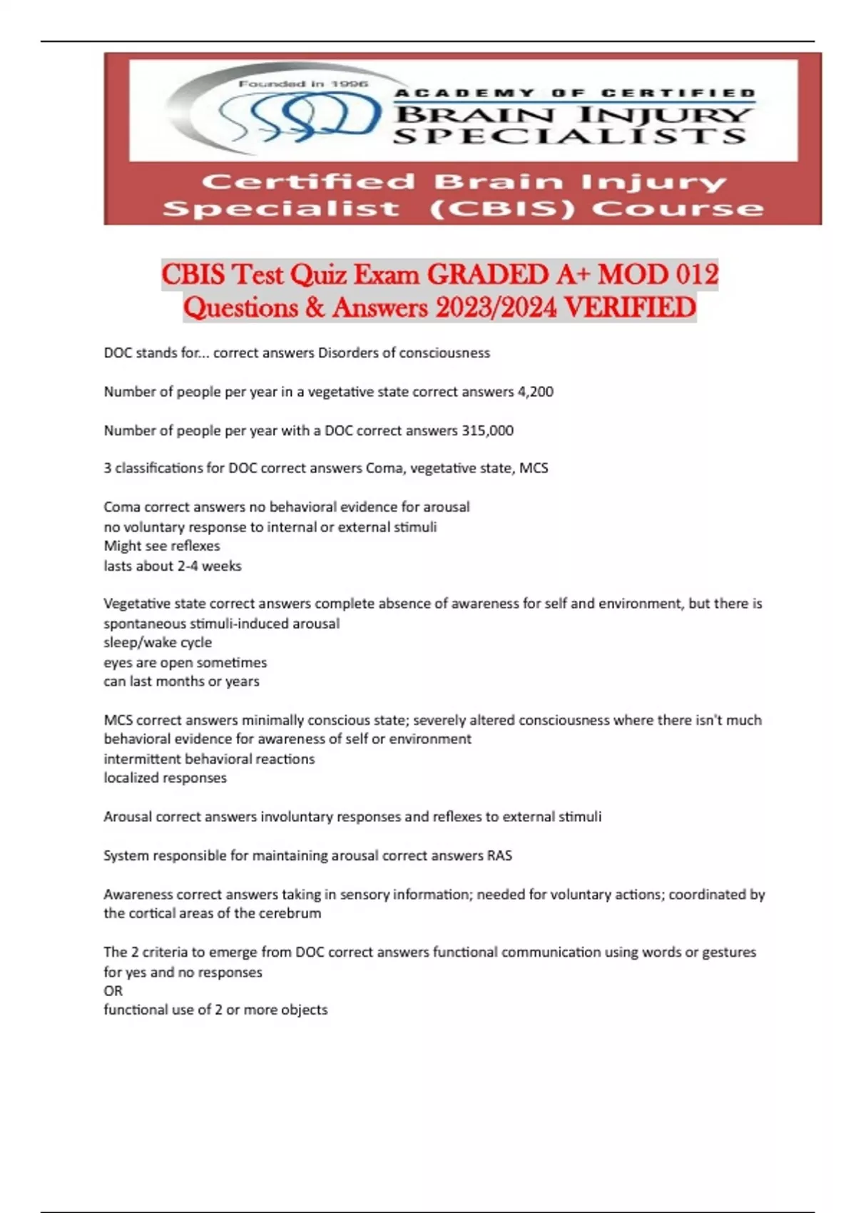 CBIS Test Quiz Exam GRADED A+ MOD 012 Questions & Answers 2023/2024 VERIFIED DOC stands for... correct answers Disorders of consciousness Number of people per year in a vegetative state correct answers 4,200 Number of people per year with a DOC correct answers 315,000 3 classifications for DOC correct answers Coma, vegetative state, MCS Coma correct answers no behavioral evidence for arousal no voluntary response to internal or external stimuli Might see reflexes lasts about 2-4 weeks Vegetative state correct answers complete absence of awareness for self and environment, but there is spontaneous stimuli-induced arousal sleep/wake cycle eyes are open sometimes can last months or years MCS correct answers minimally conscious state; severely altered consciousness where there isn't much behavioral evidence for awareness of self or environment intermittent behavioral reactions localized responses Arousal correct answers involuntary responses and reflexes to external stimuli System responsible for maintaining arousal correct answers RAS Awareness correct answers taking in sensory information; needed for voluntary actions; coordinated by the cortical areas of the cerebrum The 2 criteria to emerge from DOC correct answers functional communication using words or gestures for yes and no responses OR functional use of 2 or more objects Central apnea correct answers lack of signals from the brain to the muscles that control breathing Metabolic distress correct answers abnormal hormone responses that lead to increased energy demands Dystonia correct answers involuntary muscle contraction that causes slow, repetitive movements or abnormal postures; extreme tone or stiffness Goals for medical management of DOC correct answers maintain physical stability in order to participate in daily life as much as possible prevent medical complications provide opportunities for stimulation to the neurological system Challenges for medical management of DOC correct answers Skin breakdown, respiratory issues, bowel or bladder dysfunction, autonomic dysfunction syndrome Skin breakdown due to DOC correct answers pressure sores, friction related irritation, bowel and bladder incontinence, pressure from splints and braces Respiratory issues from DOC correct answers dependence on a trach, sleep apnea (obstructive or central), tracheal aspiration (entry of foreign matter) Bowel or bladder dysfunction due to DOC correct answers incontinence, constipation, bowel irregularities, discomfort, infections (C Diff or UTI), hygiene and skin issues ADS correct answers Autonomic dysfunction syndrome; dystonia, agitation, tachycardia (rapid heart rate), diaphoresis (sweating), hyperthermia, hypertension, tachypnea (rapid breathing) Incidence of ADS correct answers 15-33% of people with a severe TBI