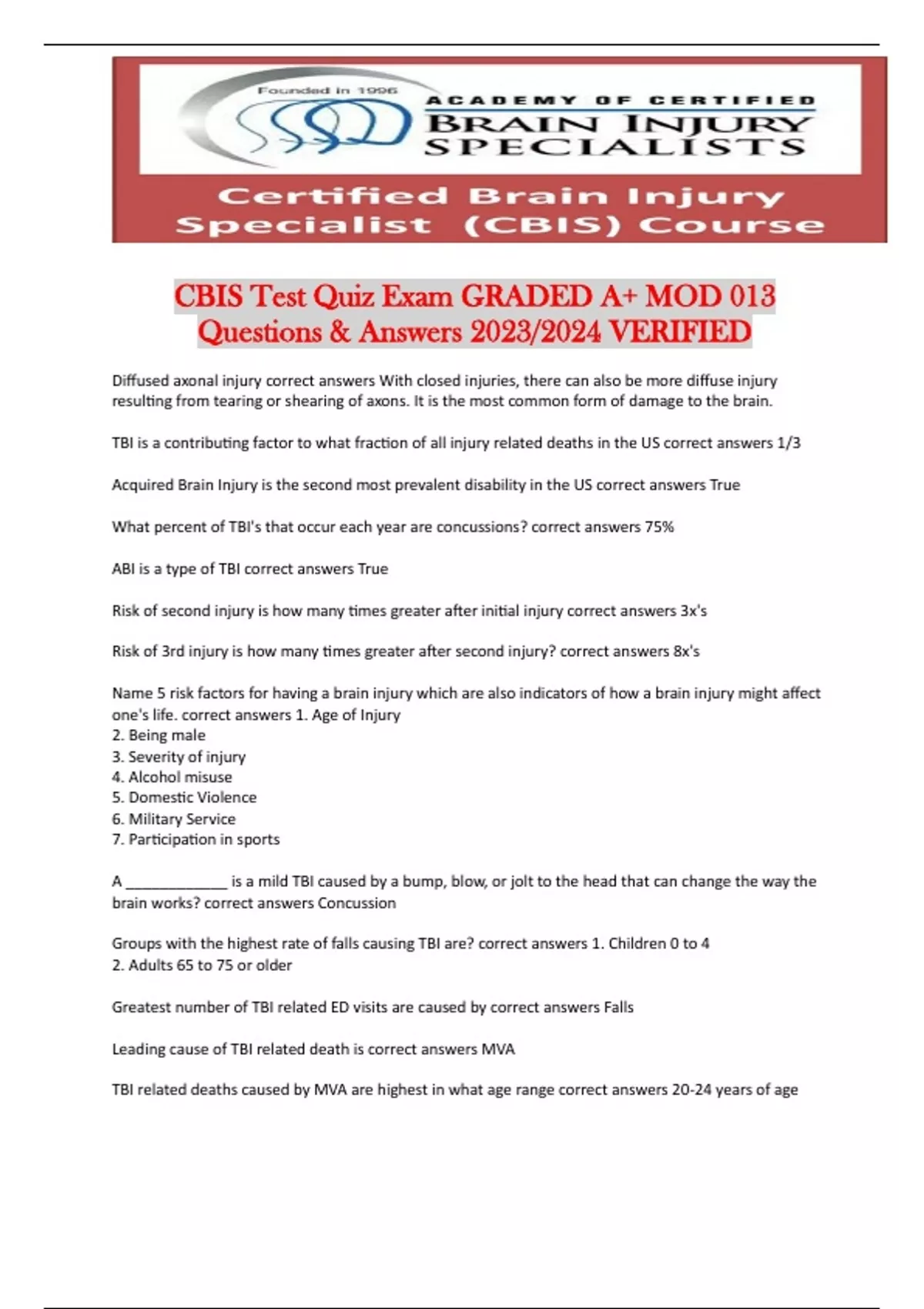 CBIS Test Quiz Exam GRADED A+ MOD 013 Questions & Answers 2023/2024 VERIFIED Diffused axonal injury correct answers With closed injuries, there can also be more diffuse injury resulting from tearing or shearing of axons. It is the most common form of damage to the brain. TBI is a contributing factor to what fraction of all injury related deaths in the US correct answers 1/3 Acquired Brain Injury is the second most prevalent disability in the US correct answers True What percent of TBI's that occur each year are concussions? correct answers 75% ABI is a type of TBI correct answers True Risk of second injury is how many times greater after initial injury correct answers 3x's Risk of 3rd injury is how many times greater after second injury? correct answers 8x's Name 5 risk factors for having a brain injury which are also indicators of how a brain injury might affect one's life. correct answers 1. Age of Injury 2. Being male 3. Severity of injury 4. Alcohol misuse 5. Domestic Violence 6. Military Service 7. Participation in sports A ____________ is a mild TBI caused by a bump, blow, or jolt to the head that can change the way the brain works? correct answers Concussion Groups with the highest rate of falls causing TBI are? correct answers 1. Children 0 to 4 2. Adults 65 to 75 or older Greatest number of TBI related ED visits are caused by correct answers Falls Leading cause of TBI related death is correct answers MVA TBI related deaths caused by MVA are highest in what age range correct answers 20-24 years of age True or False: Moderate TBI will be marked by loss of consciousness for a period of 4-24 hours. correct answers FALSE - Moderate TBI LOC is 0-24 hours Rates for TBI are highest in which sports? correct answers mens football and womens soccer What is the estimated cost (due to medical and low productivity) for people with TBI? correct answers $76.5 billion What Supreme Court decision asserts that states administer their services, programs, and activities "in the most integrated setting appropriate to the needs of qualified individuals with disabilities" regardless of age? correct answers Olmstead Describe the TBI Act of 1996 correct answers 1. NIH (National Institutes of Health) to focus on: conducting research 2. HRSA - improving services 3. CDC - preventing TBI What was established in 1987 by NIDRR and what was its purpose? correct answers TBI Model systems - to conduct prospective, longitudinal research to demonstrate the course of recovery and outcomes following TBI at 16 centers. Maintains the Model Systems Knowledge Translation Center. True or False: Persons with TBI are twice as likely to die as similar non-brain injured persons and have a life expectancy of approximately 7 years less than age-related peers correct answers TRUE Name 2 NeuroEndocrine disorders associated with TBI. correct answers Hypothyroidism Growth Hormone Gonadotropin Deficiency