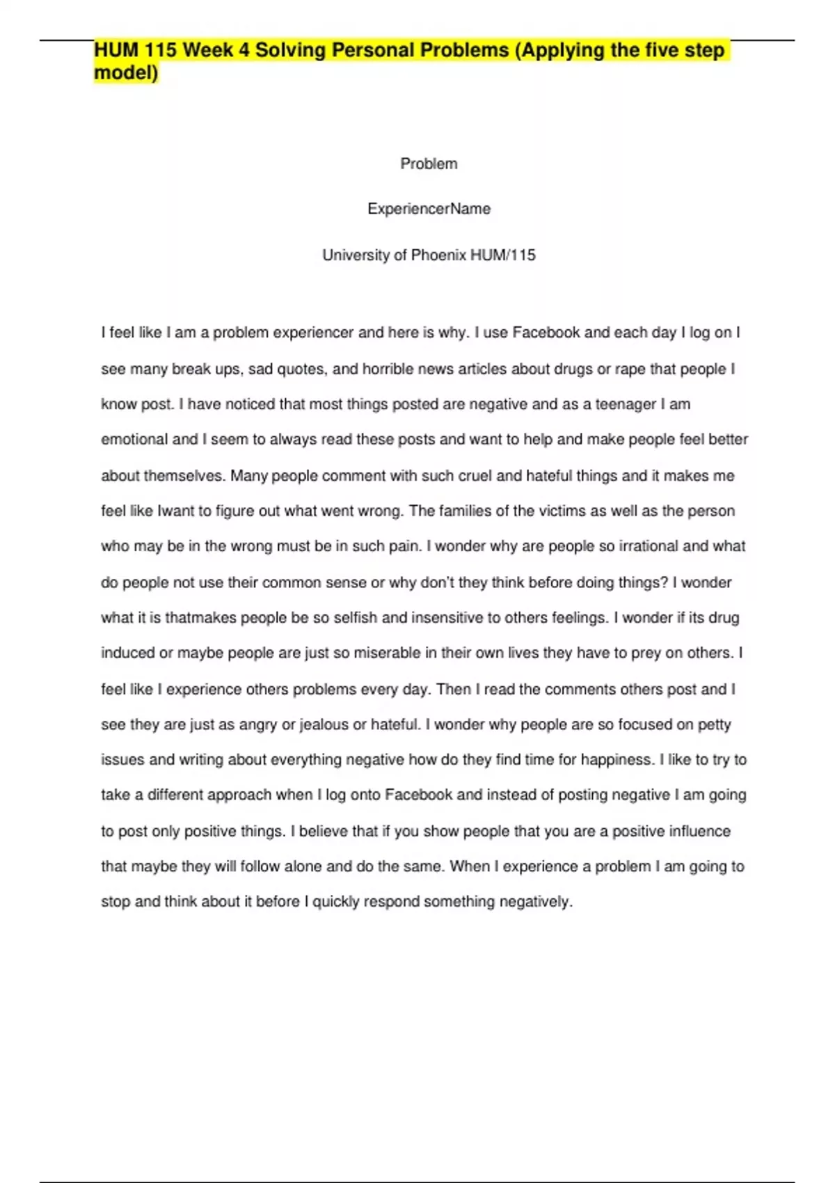 HUM 115 Week 4 Solving Personal Problems (Applying the five step model).HUM 115 Week 4 Solving Personal Problems (Applying the five step model) Problem Experiencer Name University of Phoenix HUM/115 I feel like I am a problem experiencer and here is why. I use Facebook and each day I log on I see many break ups, sad quotes, and horrible news articles about drugs or rape that people I know post. I have noticed that most things posted are negative and as a teenager I am emotional and I seem to always read these posts and want to help and make people feel better about themselves. Many people comment with such cruel and hateful things and it makes me feel like I want to figure out what went wrong. The families of the victims as well as the person who may be in the wrong must be in such pain. I wonder why are people so irrational and what do people not use their common sense or why don’t they think before doing things? I wonder what it is that makes people be so selfish