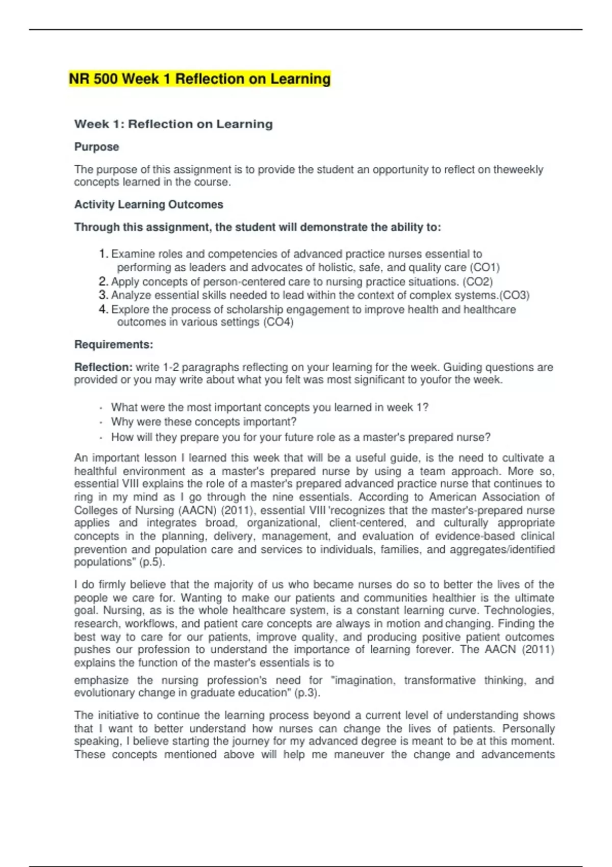 NR 500 Week 1 Reflection on Learning NR 500 Week 1 Reflection on Learning Week 1: Reflection on Learning Purpose The purpose of this assignment is to provide the student an opportunity to reflect on the weekly concepts learned in the course. Activity Learning Outcomes Through this assignment, the student will demonstrate the ability to: 1. Examine roles and competencies of advanced practice nurses essential to performing as leaders and advocates of holistic, safe, and quality care (CO1) 2. Apply concepts of person-centered care to nursing practice situations. (CO2) 3. Analyze essential skills needed to lead within the context of complex systems. (CO3) 4. Explore the process of scholarship engagement to improve health and healthcare outcomes in various settings (CO4)