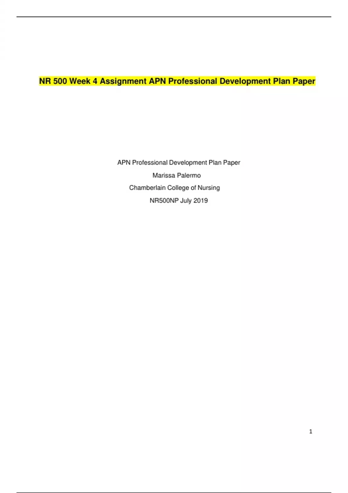 NR 500 Week 4 Assignment APN Professional Development Plan Paper (4).NR 500 Week 4 Assignment APN Professional Development Plan Paper APN Professional Development Plan Paper Marissa Palermo Chamberlain College of Nursing NR500NP July 2019 1APN Professional Development Plan Paper This paper reviews the scope of practice for Florida nurse practitioners. It covers general information as well as required certifications, licensure, and education requirements. In addition, this paper will also cover the core competencies, leadership skills, and different areas of advanced practice. The professional license that nurse practitioners hold is governed by the Florida Nurse Practice Act and the Florida Department of Health. Unfortunately, Florida is one of the most restricted practice states in the United States. This means nurse practitioners need to abide by stricter guidelines under the supervision of a doctor according to Florida state law. Furthermore, this plan will provide information that will act as a guide for pursuing a nurse practitioner license and certification. APN Scope of Practice In the state of Florida, the Florida a board of nursing currently regulates Advanced Practice Registered Nurse licensure. To become a nurse practitioner or advance practice nurse, an individual must first be a registered nurse and hold a valid registered nurse license from any jurisdiction and a Bachelor of science in nursing, (BSN) degree (FBON, 2019). After obtaining a BSN, “a master’s degree or a post- master’s certificate in a nursing clinical specialty area and a national advanced practice certification from an approved nursing specialty board” is required before applying for the Florida state board licensure (FBON, 2019). Comparable to applying for the RN licensure from the Florida board of nursing, when applying to take the advanced practice nursing boards a clear background check with finger printing is required (FBON, 2019). Most masters level education schools will also require this. Nurse practitioners’ scope of practice depends on which state they are obtaining their license. There is full practice, reduced practice, and restricted practice. Currently, there are 21 states in the United States that have full practice status. This means a nurse practitioner is able 2to evaluate patients, diagnose patients, read diagnostic tests, manage treatments, and write prescriptions for different medications including controlled substances (AANP, 2015). If desired nurse practitioners in a full practice state may have their own practice and see their own patients. In reduced practice, the state requires a collaborative agreement with another healthcare professional before providing care to patients (AANP, 2018). The state of Florida is currently a restricted practice (AANP, 2019). A restricted practice has stricter laws which governs the scope of practice. Nurse practitioners under licensure laws do not have the ability to provide full care to their patients without career-long supervision (AANP, 2018). This requires the nurse practitioner to work under the direction of a physician, and are not permitted to prescribe medication without the supervision or written protocol of a physician (AANP, 2018). Nurse practitioners are primary care providers licensed under chapter 458, chapter 459, and chapter 464 (FBON, 2019). According to these state regulations, nurse practitioners can provide care in various healthcare settings. This includes long-term care facilities, acute care facilities, general primary care and general pediatric care settings.