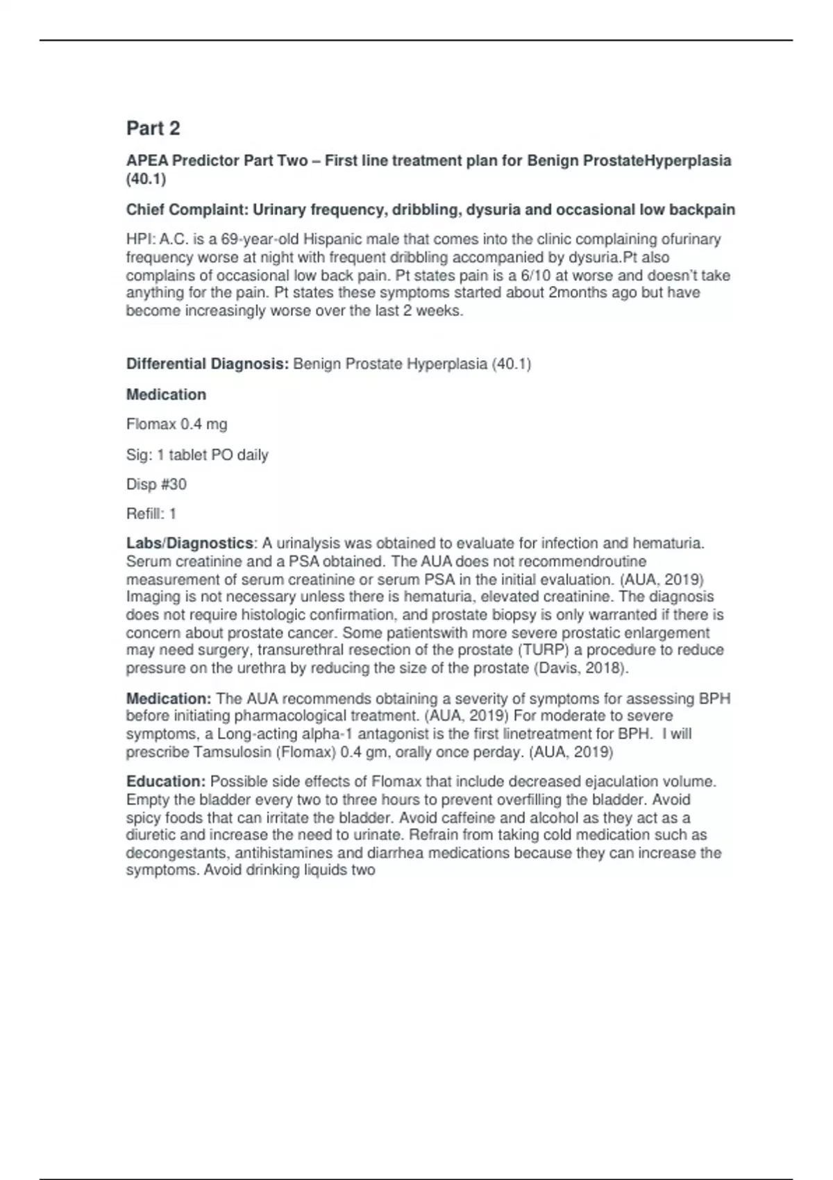NR603 Week 5 Part 2 APEPart 2 APEA Predictor Part Two – First line treatment plan for Benign Prostate Hyperplasia (40.1) Chief Complaint: Urinary frequency, dribbling, dysuria and occasional low back pain HPI: A.C. is a 69-year-old Hispanic male that comes into the clinic complaining of urinary frequency worse at night with frequent dribbling accompanied by dysuria. Pt also complains of occasional low back pain. Pt states pain is a 6/10 at worse and doesn’t take anything for the pain. Pt states these symptoms started about 2 months ago but have become increasingly worse over the last 2 weeks. Differential Diagnosis: Benign Prostate Hyperplasia (40.1) Medication Flomax 0.4 mg Sig: 1 tablet PO daily Disp #30 Refill: 1 Labs/Diagnostics: A urinalysis was obtained to evaluate for infection and hematuria. Serum creatinine and a PSA obtained. The AUA does not recommend routine measurement of serum creatinine or serum PSA in the initial evaluation. (AUA, 2019) Imaging is not necessary unless there is hematuria, elevated creatinine. The diagnosis does not require histologic confirmation, and prostate biopsy is only warranted if there is concern about prostate cancer. Some patients with more severe prostatic enlargement may need surgery, transurethral resection of the prostate (TURP) a procedure to reduce pressure on the urethra by reducing the size of the prostate (Davis, 2018).A Predictor.